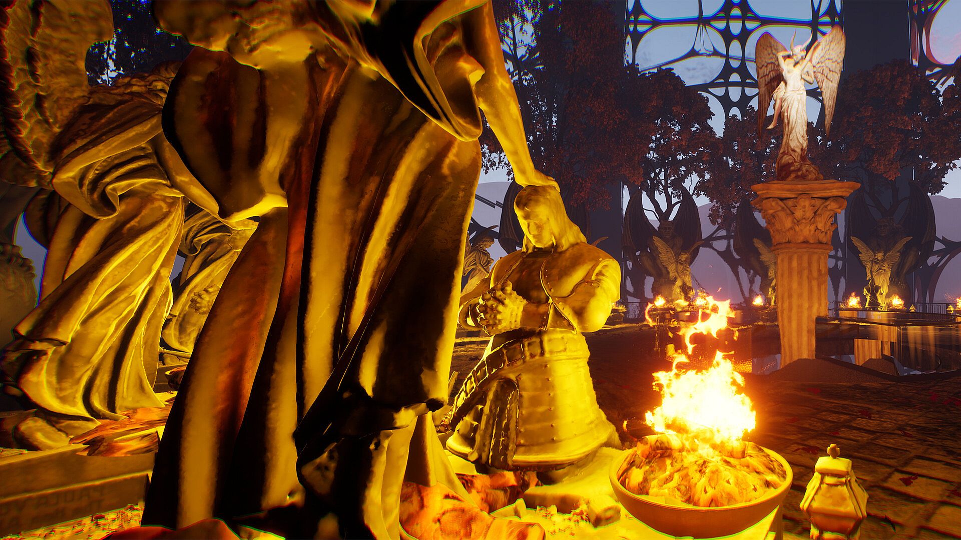 Autumn – Explore a volcanic realm of red forests and ancient statues of angels and demons, their fires lighting the foggy dusk. The world glows in deep crimson hues.