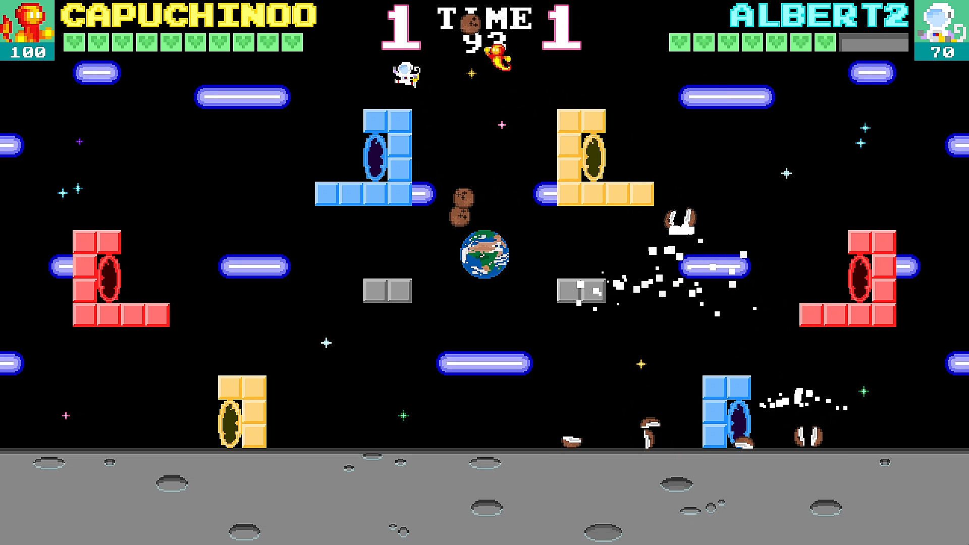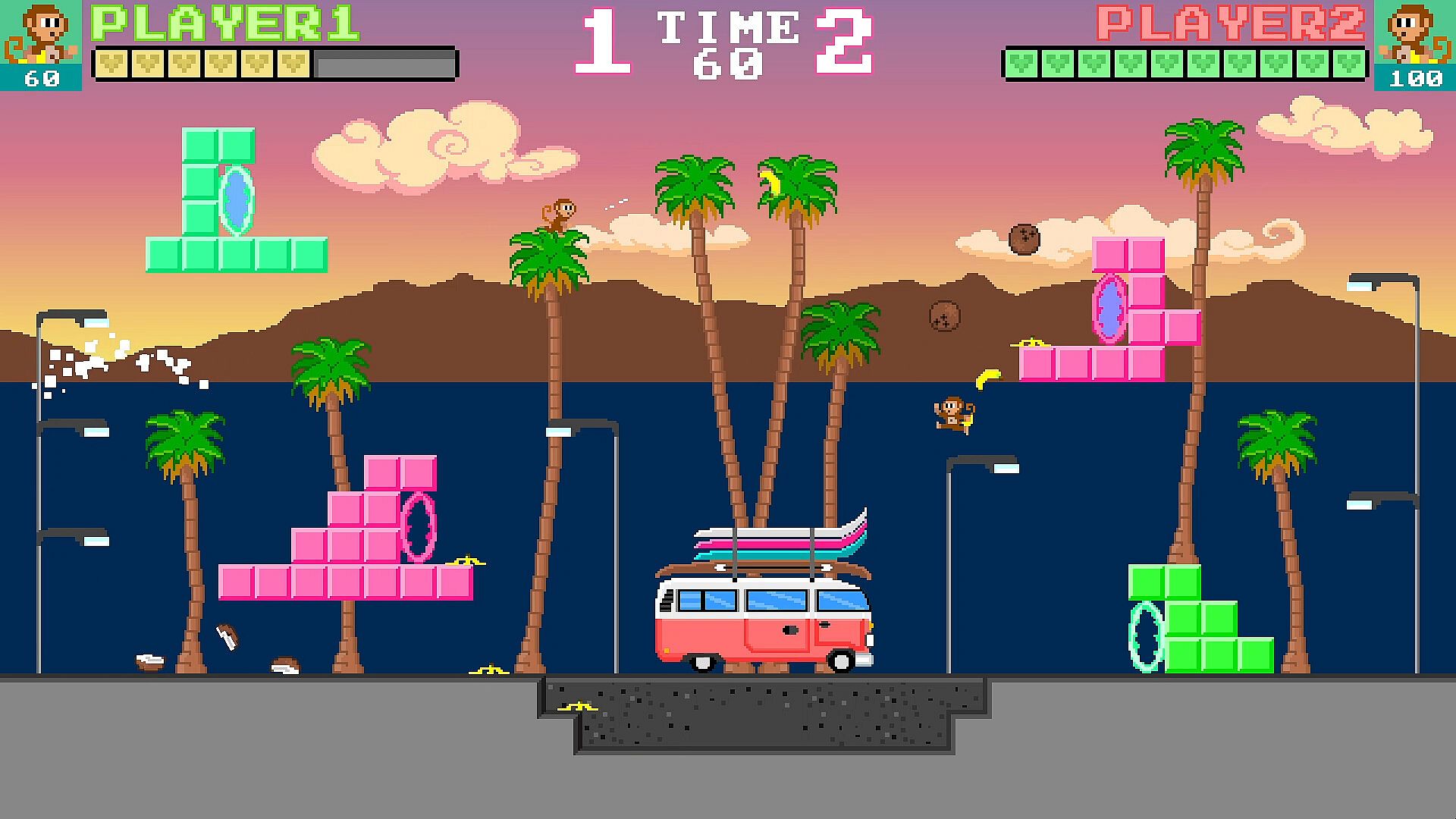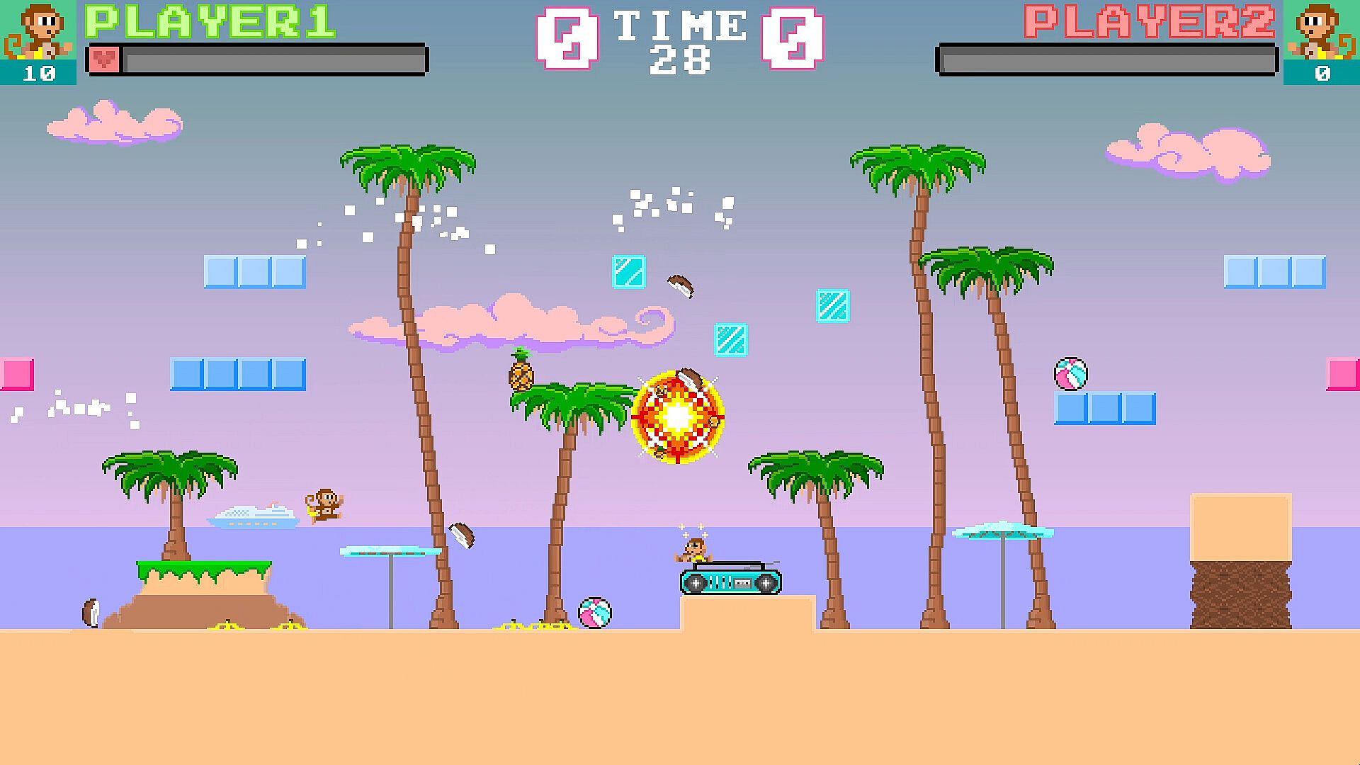Monkey Fruit Fight! brings competitive shooter mechanics to a colorful 2D world. Jump, dodge, aim, and fire in lightning-fast 1v1 battles that feel like arena FPS shooters meets retro arcade gaming! Dominate friends and strangers alike to the beat of a pumping synthwave soundtrack!
