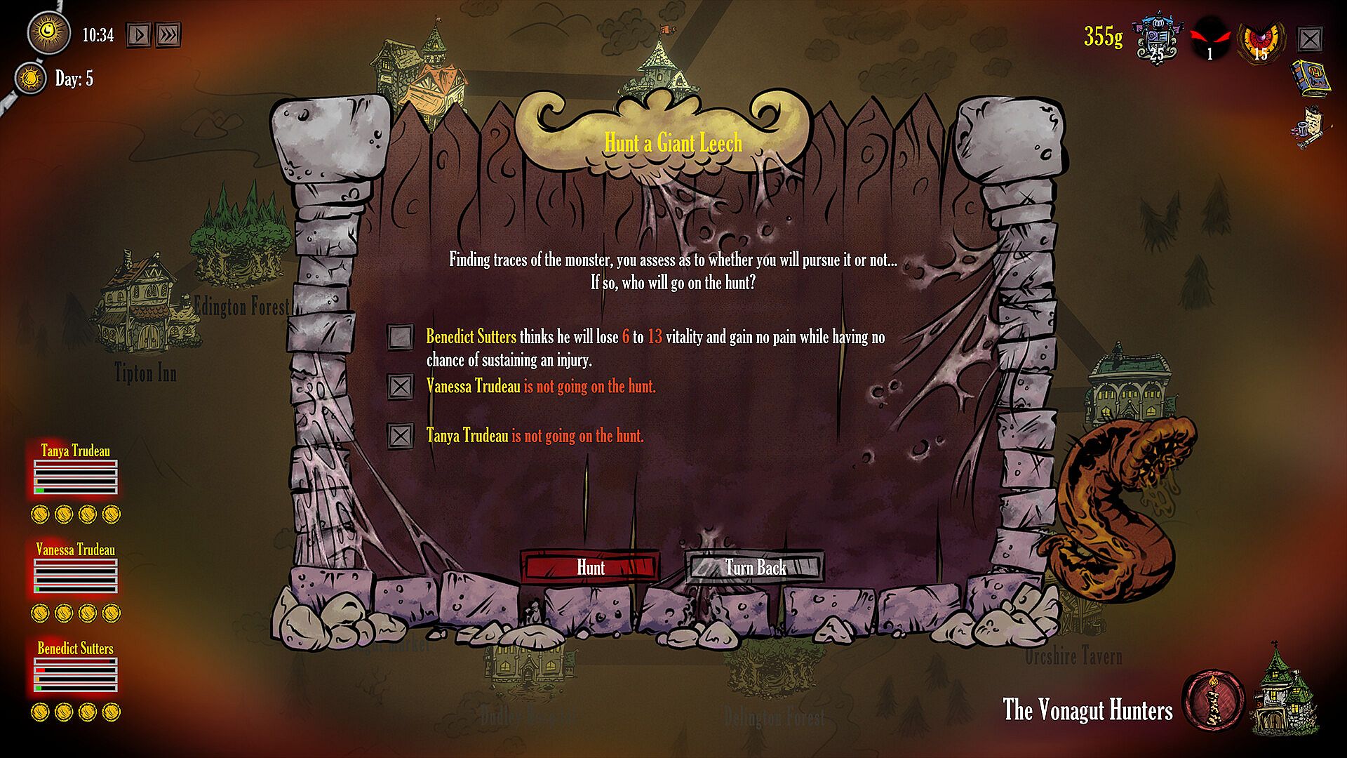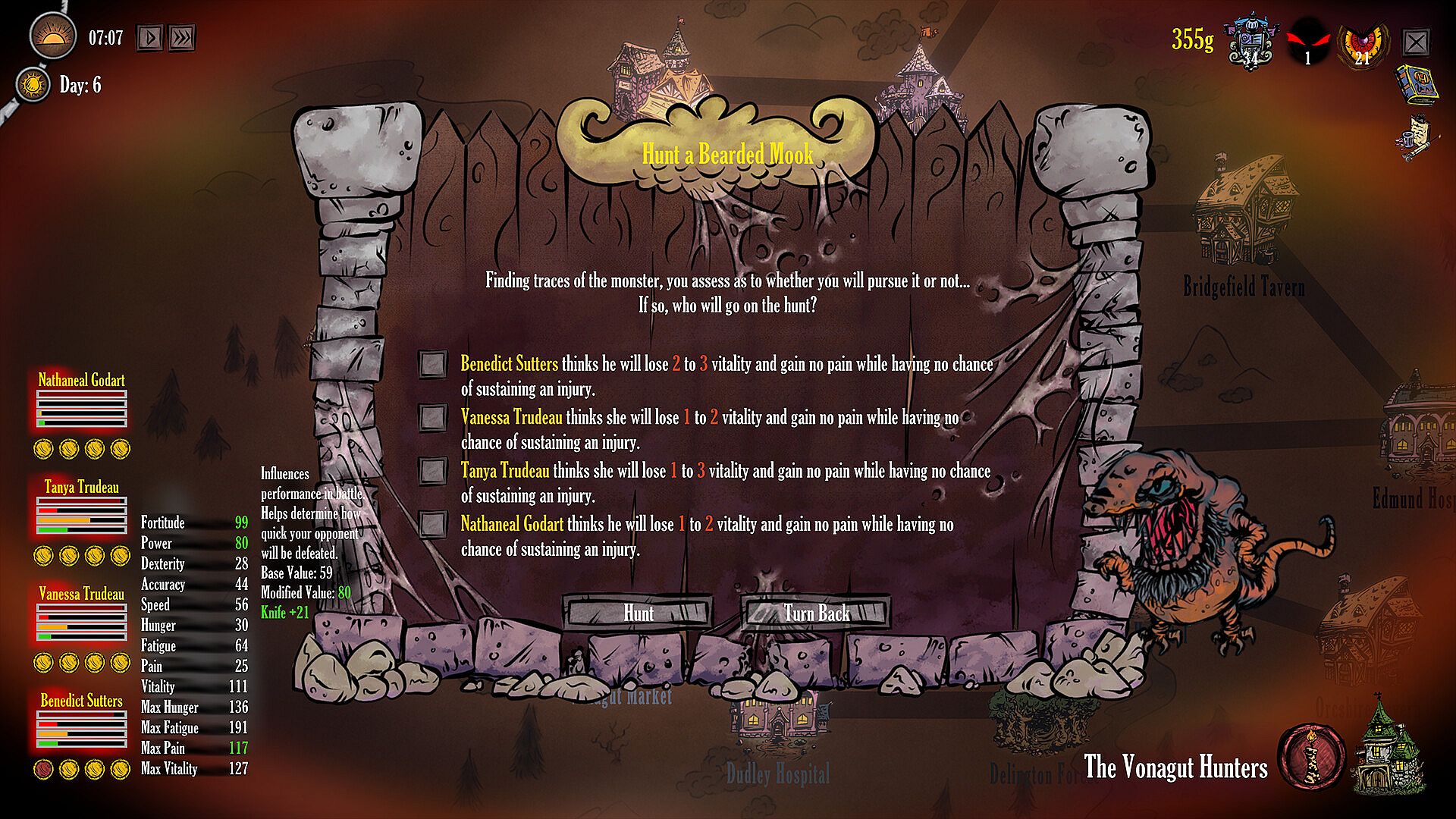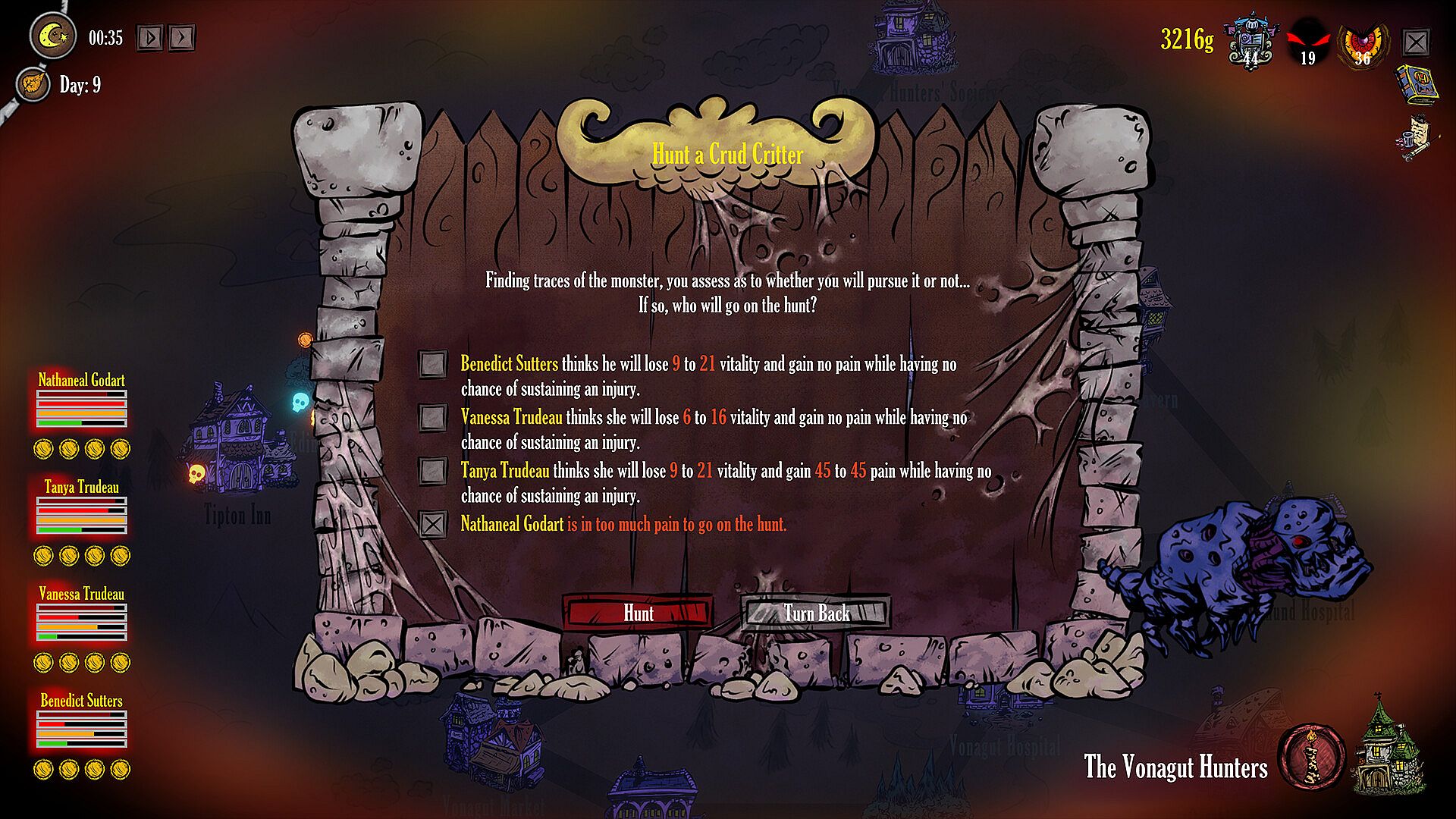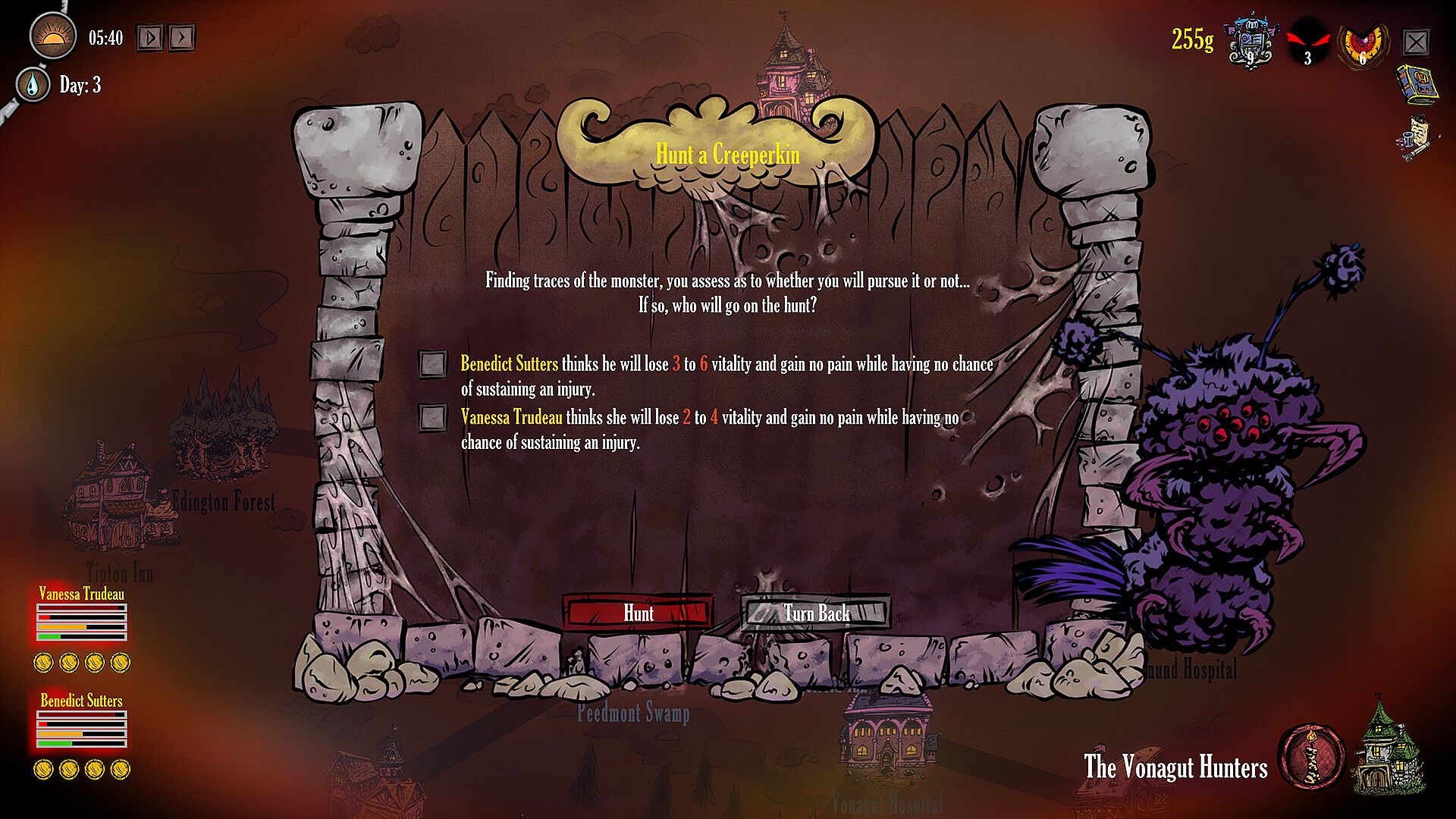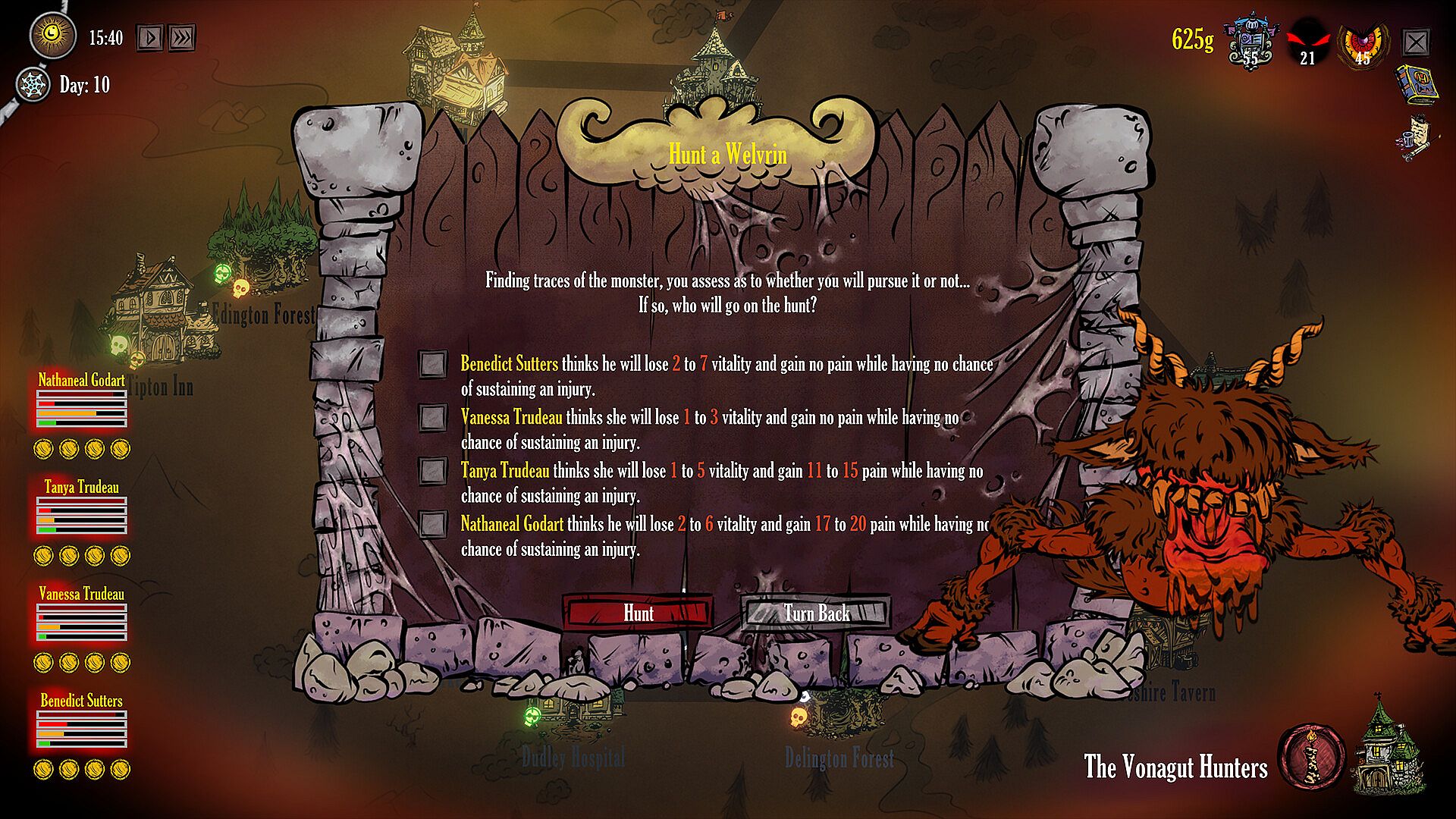 Make the right choices of who should go on a hunt and who should stay behind, taking into consideration your hunters’ individual levels of vitality, pain, and energy. All your hunters’ stats make a difference in the outcome of a battle - such as the time it takes to fight, chances of injury, and more.
