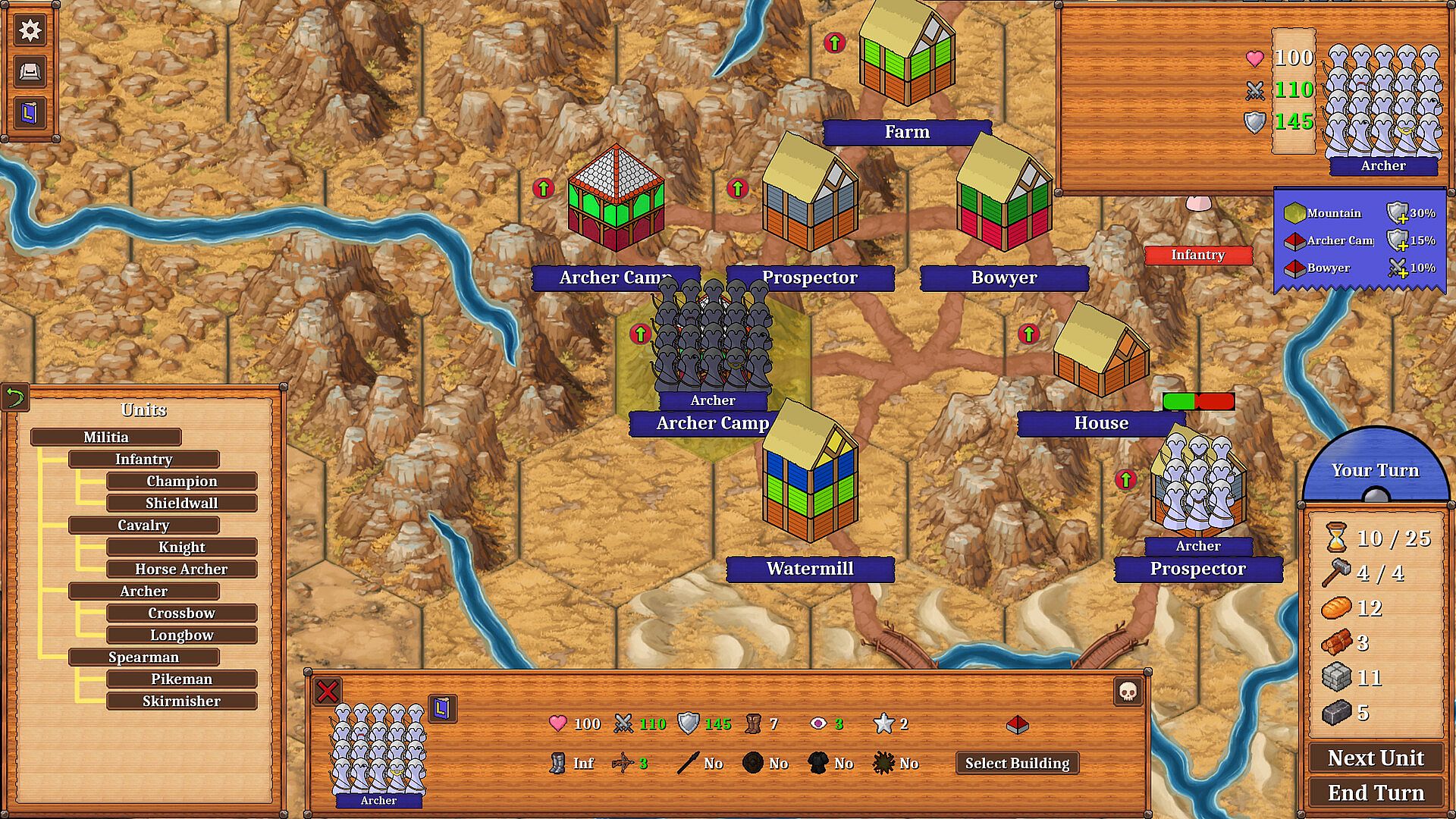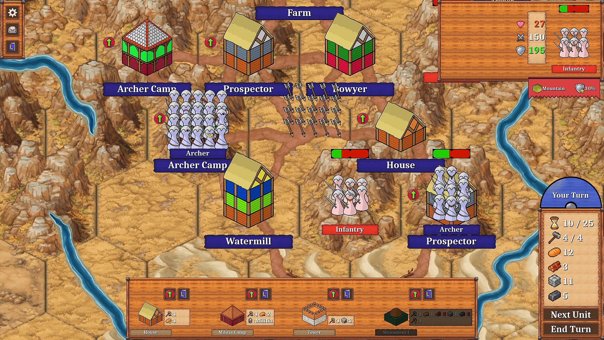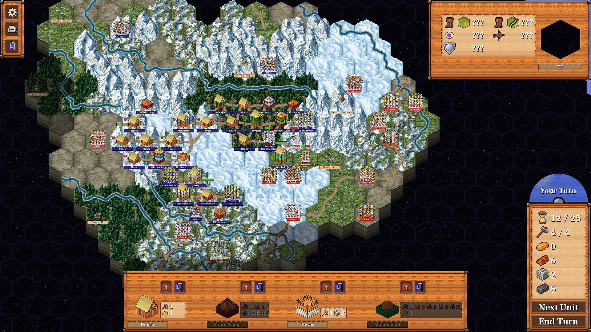 Monument is a medieval turn-based strategy game. You start with just a town center and need to expand and construct a variety of buildings to collect enough resources to construct the titular monument. Finding suitable terrain and natural resources to scavenge can prove challenging with the constant onslaught of raiders trying to tear down everything you just built. Your goal is to gather resources, mount a defense force, beat back the attackers and survive long enough to consctruct the monument.