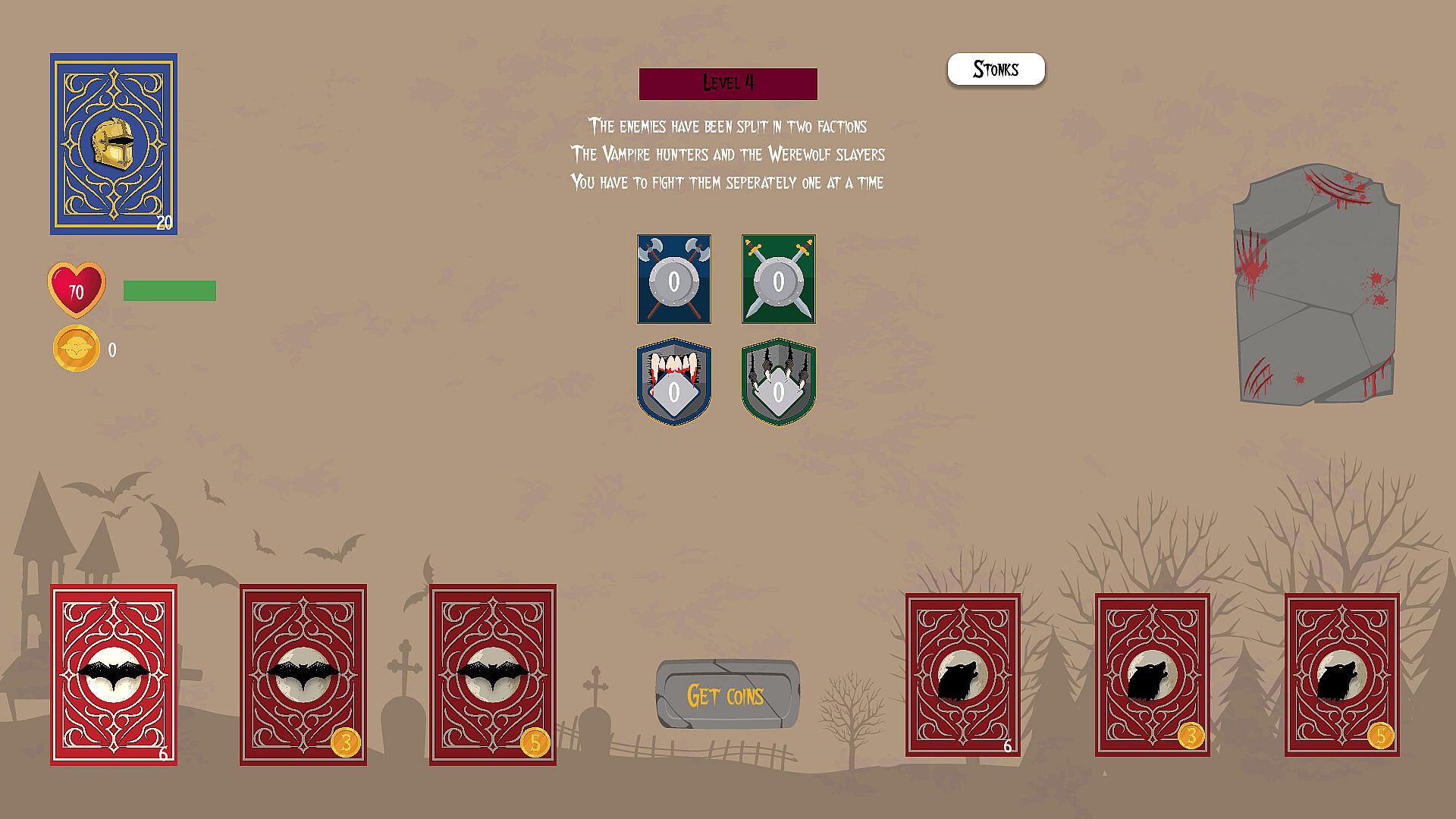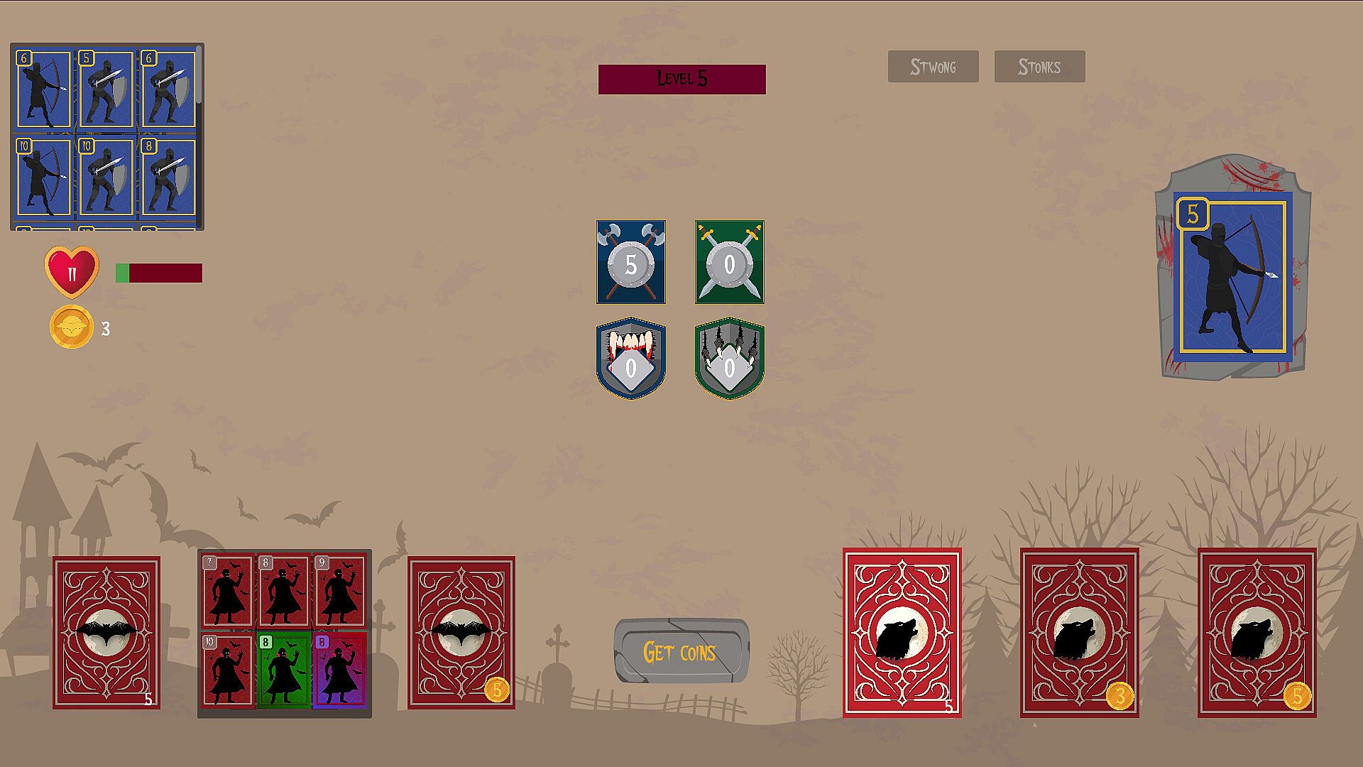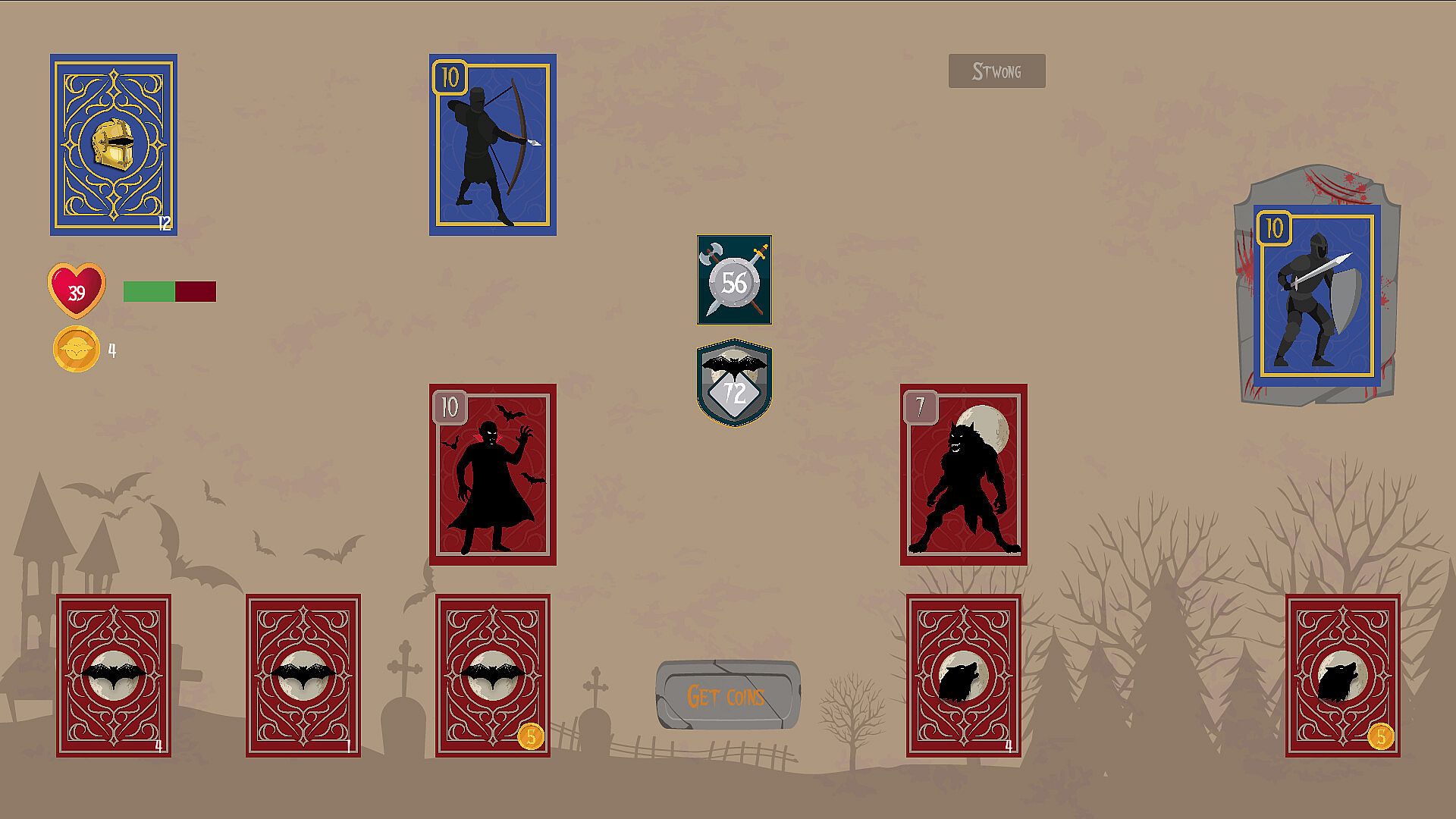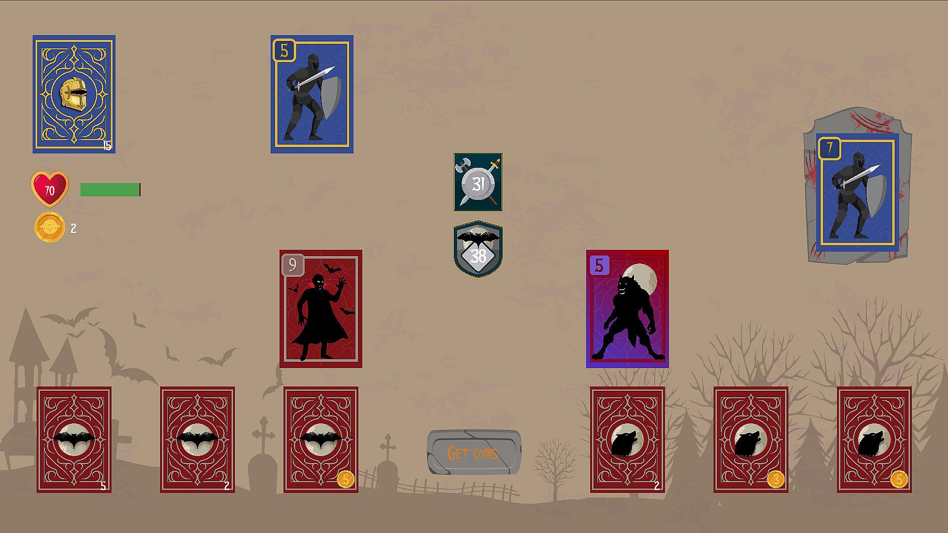 Unite the strength of the Vampires and the Werewolves and combine their defences in a unlikely alliance to defend from the humans. Select your moves between playing cards, earning coins or unlocking stronger decks to survive their rampage. Choose your desired rewards and build unique decks to survive their next attack!