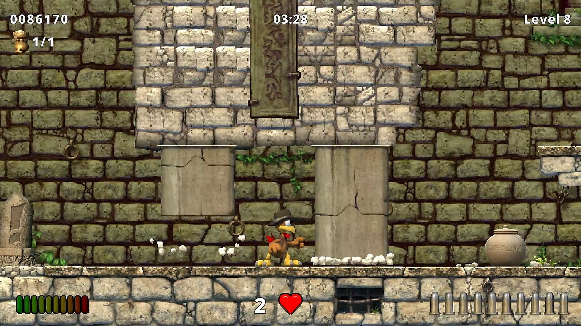 As you would expect from a proper jump and run platformer, you need to use all your physical strength, courage, and skill. Jumping and swinging, kicking, boxing and sometimes even shooting, Moorhuhn races through the depths of the jungle to find the treasure of treasures: The Amulet of WHATSIT.