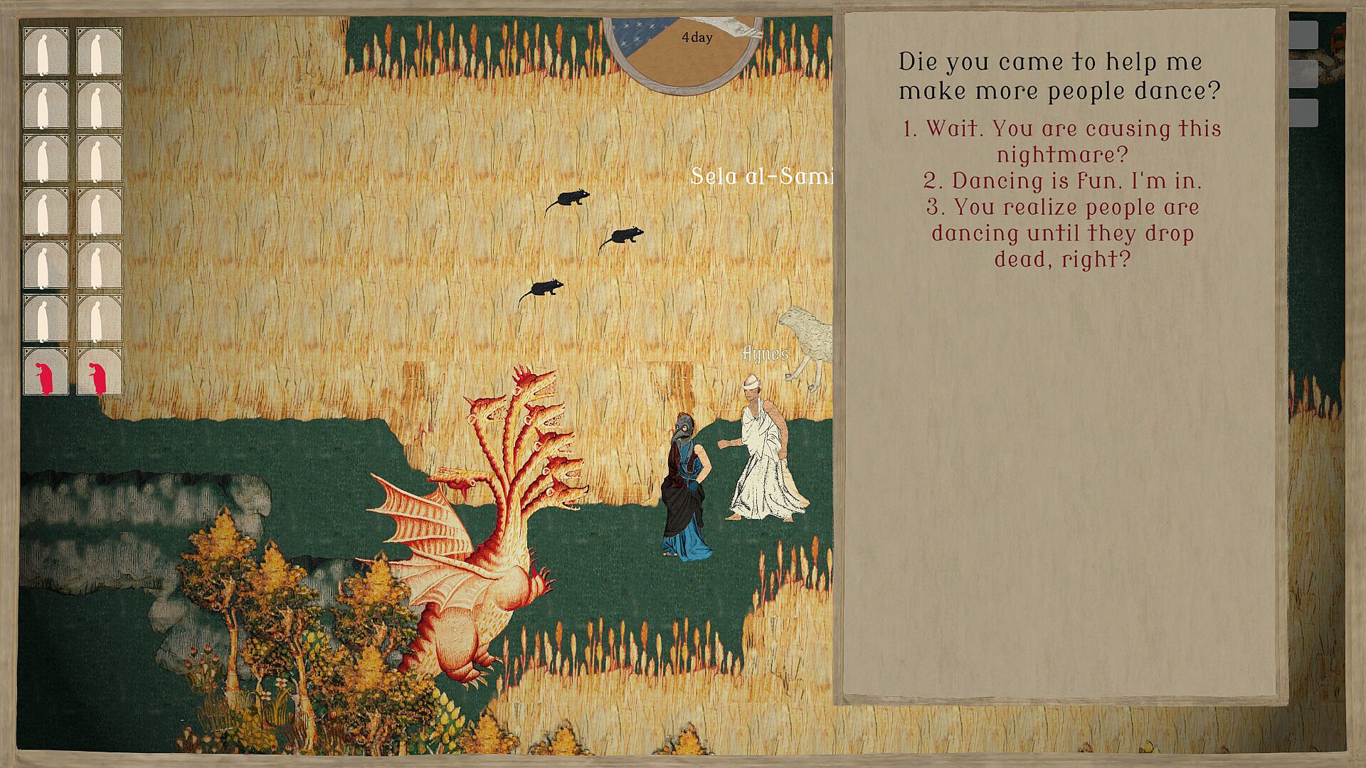Explore a dying town in a 2D top-down world on a tapestry during the times of the Black Death.