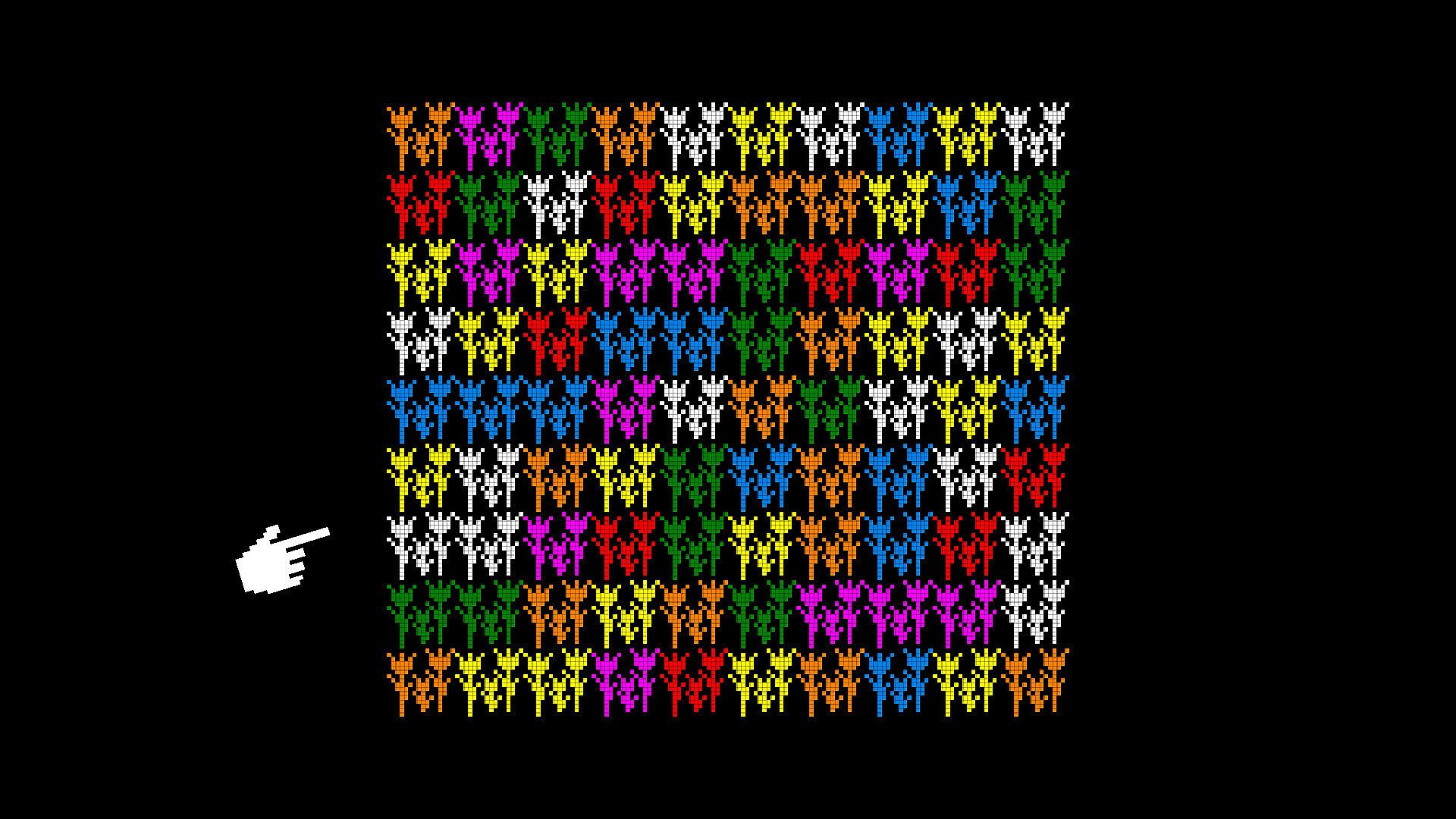 Colorful pixel flowers grow in real time, slowly spreading into adjacent spaces, and sometimes mutate into new but similar colors. You can't place flowers directly, only remove them or encourage them to spread faster using your watering can.
