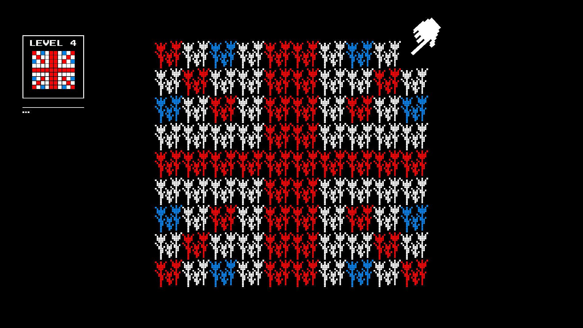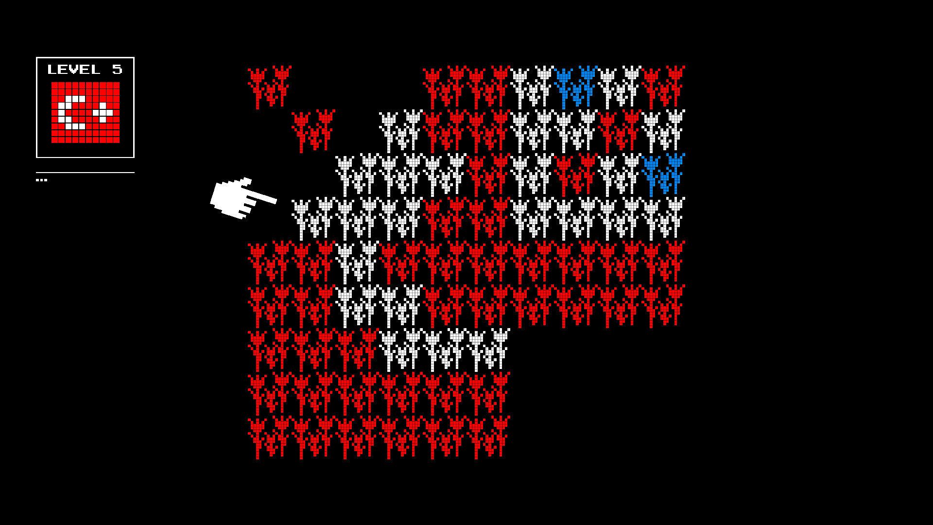 Flowers spread on their own, 4-directionally, at unpredictable intervals. When they sprout in new spaces, they may subtly mutate. Sometimes becoming exactly the color you need, exactly where you need it… sometimes not. To guide a color across the field, you'll have to carve pathways, dismantle parts of your work, and carefully make room for growth.