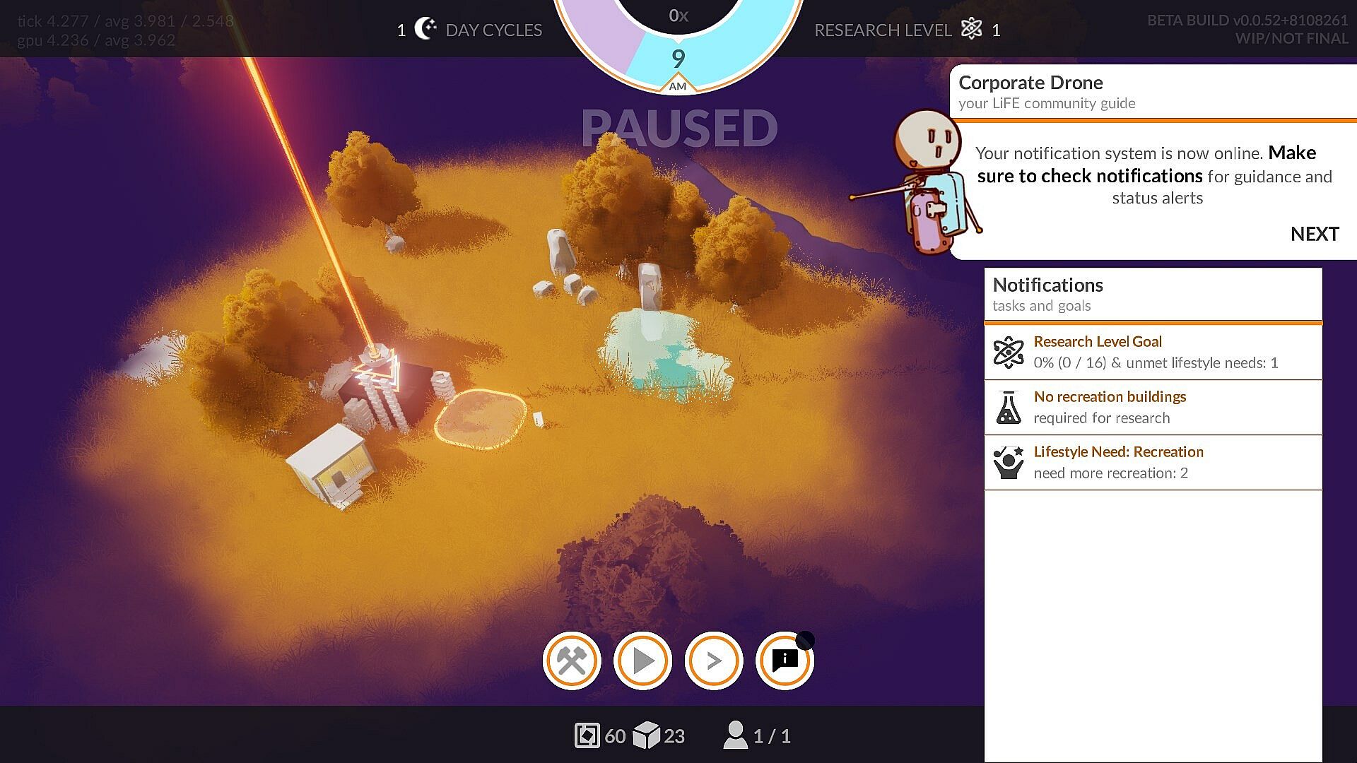 Progress through Research Levels to progress technology, but pay attention to resident expectations: with higher level technology they'll have higher expectations to progress. With plenty of recreation time, we research ways to improve our community and figure out new ways to do things.