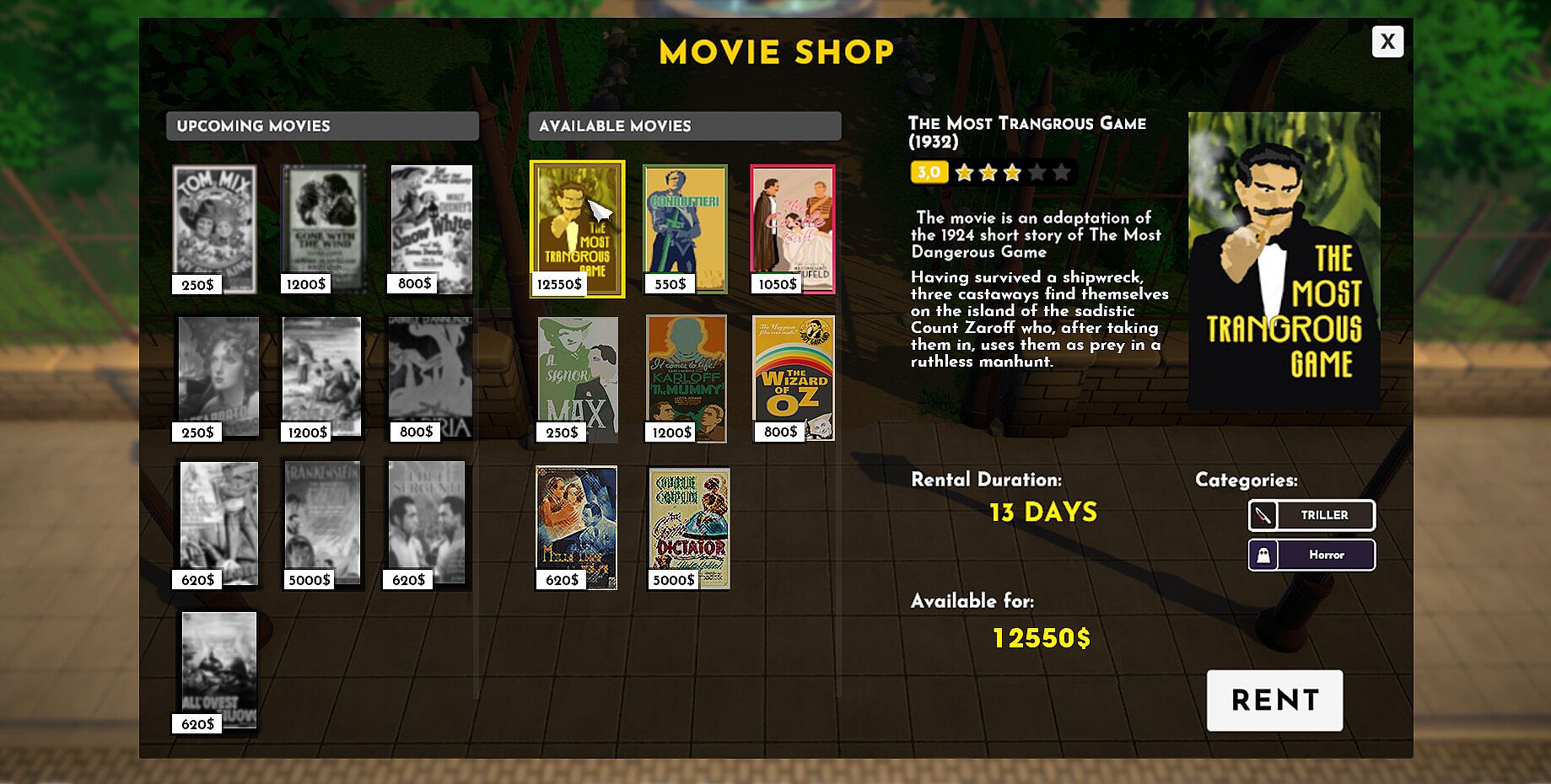 A fine establishment like yours requires the finest team. Carefully pick your hires and keep them happy to get the best out of them. Manage cashiers, janitors, projectionists, and other jobs exclusive to the level's time and place!