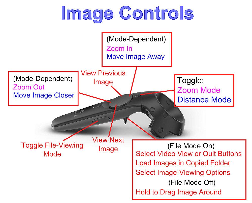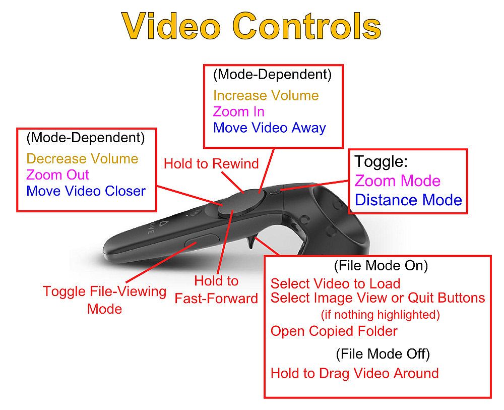 MovingPictures enables viewing of videos and galleries of (.png, .jpg, and .gif) images using the Vive VR headset. Using one or both controllers, you can load videos and images from your computer, then freely move them around and resize them in the VR space in front of you. If at any point you forget the controls, you can simply turn around to see them mapped out on the Vive controller.