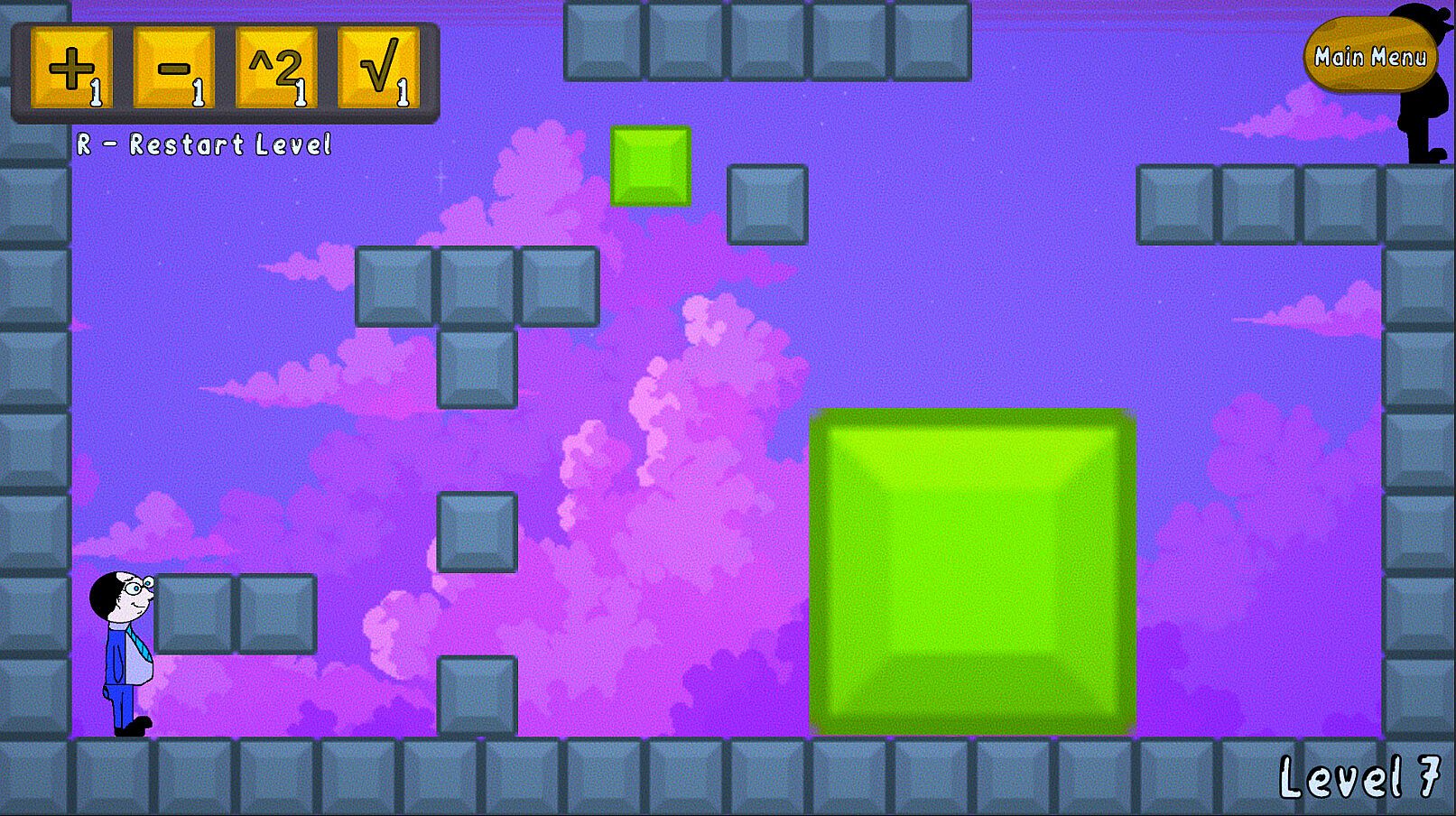 Mr. Mat Hematic is a short, fun, 2D platformer puzzle game where you must use given mathematical operations to alter the environment so you can move around. To complete a level, you need to reach the black door.