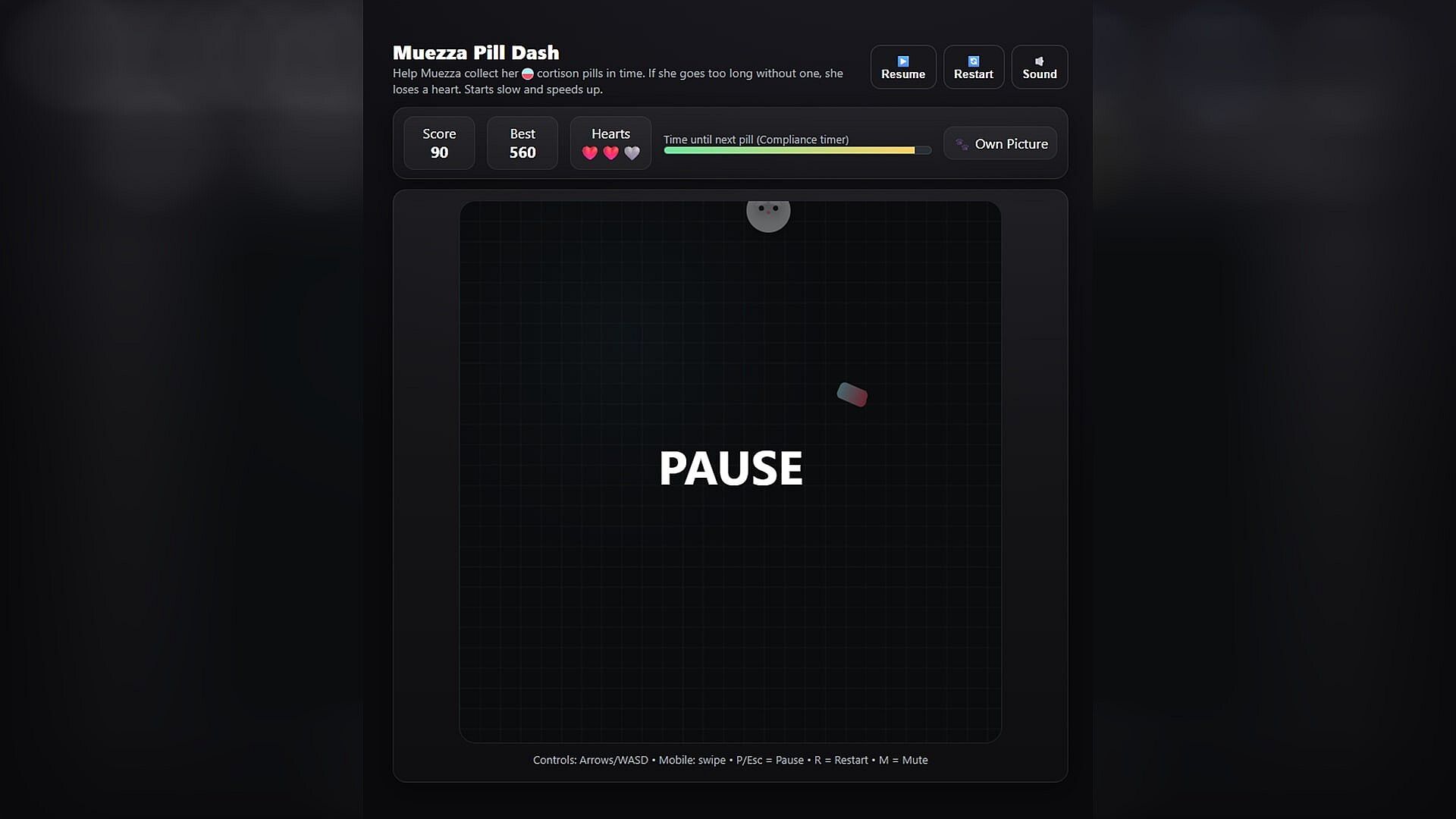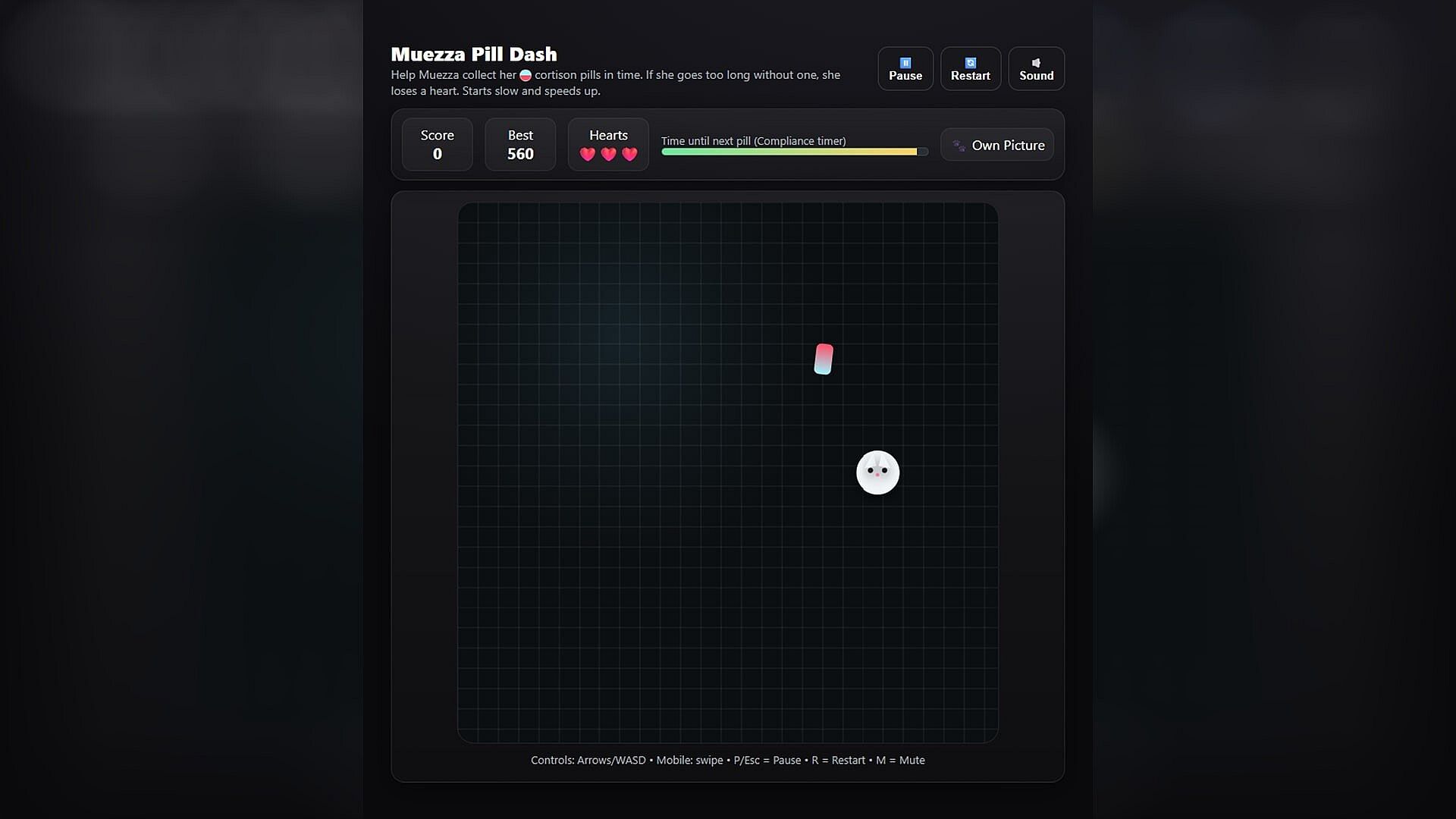 Muezza Pill Dash was made out of love for a real cat who takes cortison medication because of her medical condition.