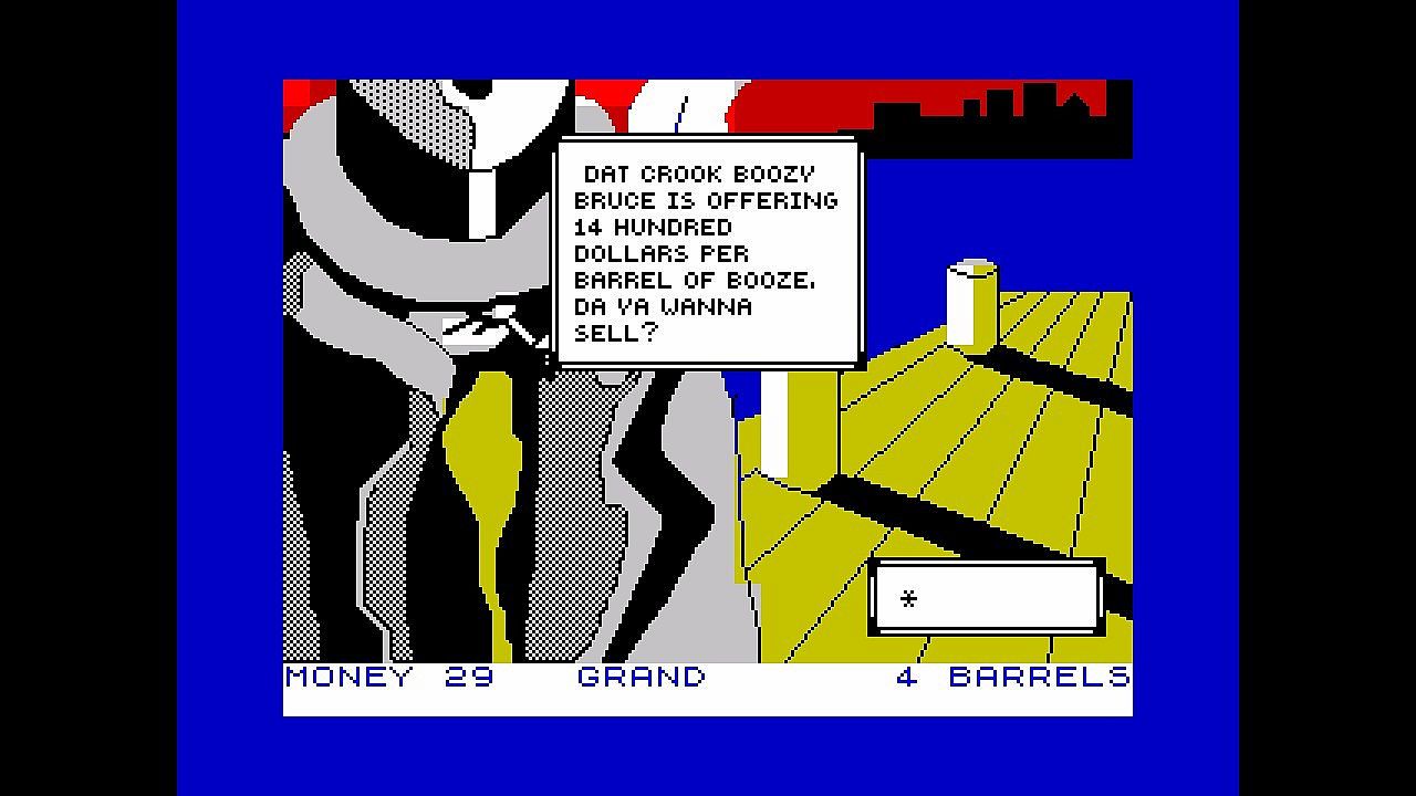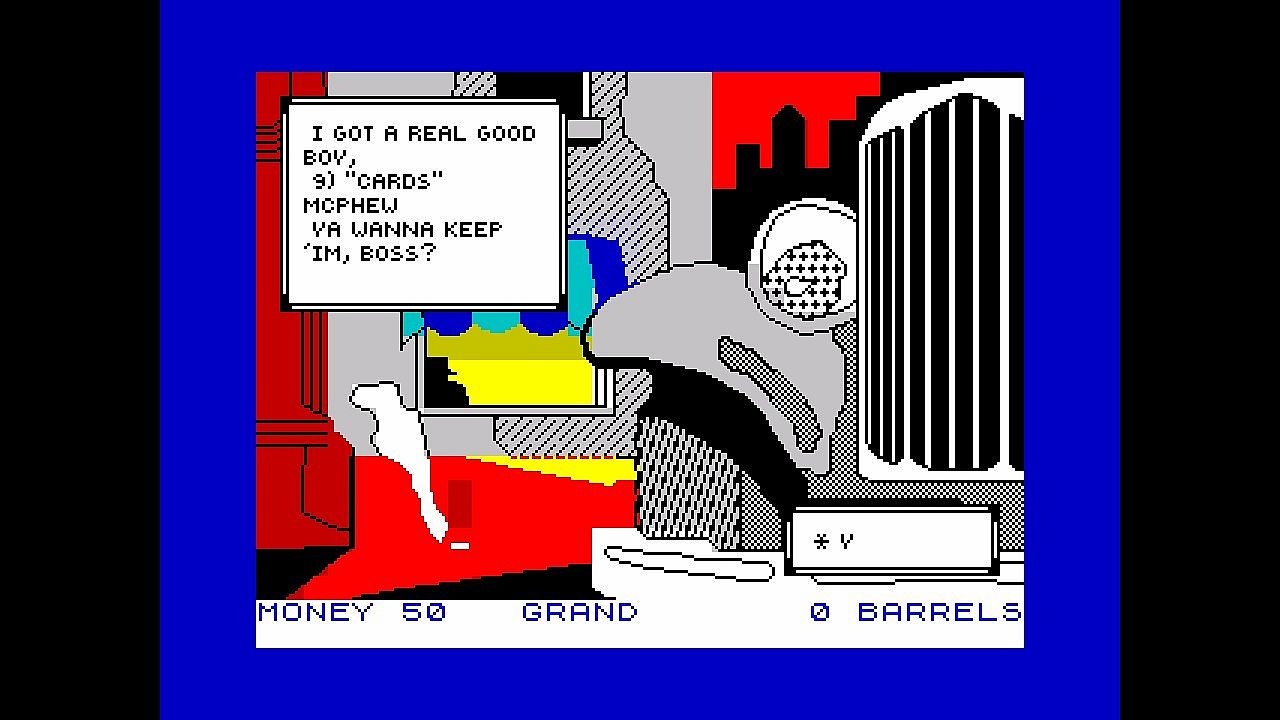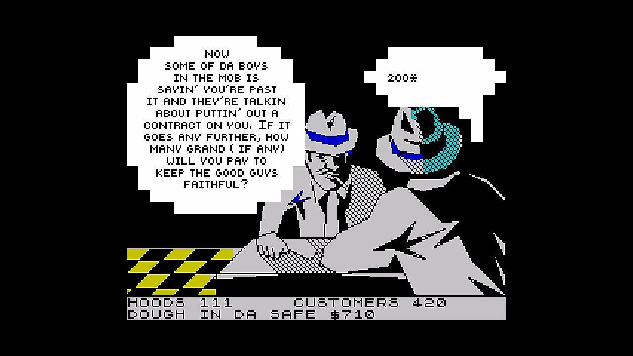 Type in your answers to decide how much to buy, sell, squeeze, bribe etc. After each year's decisions are made a short cinematic sequence shows how the year went. But watch out - if you do too well, rival mobs might put out a contract on you, and you'll have to defend yourself in a shootout sequence.