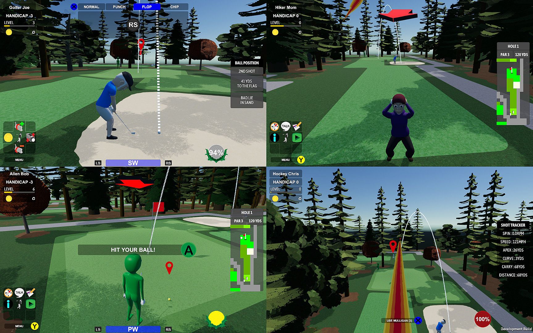 Mulligans Golf Game is a wacky, arcade golfing game. Gameplay is designed to give the player complete freedom to play how they want in the world of a simplified yet challenging golfing experience. It is not a Sim! But it is designed to provide the scenarios and emotions that come when playing real golf. Players choose from the available pool of legendary characters and hand crafted courses, either playing solo or with friends up to 3 Friends (local split screen or online), attempting to set new Personal Bests, going for Course Records (local and global leaderboards), or challenging friends to see who is the best!