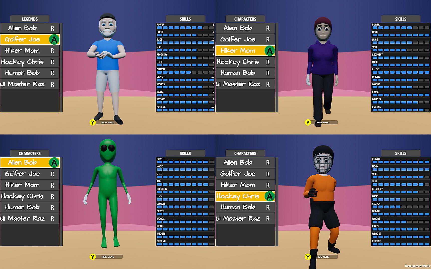 Choose from 11 Legendary characters to play with, each with their own set of Golf Skills. Use the Dummy, designed for testing out golf training programs. One of the Stickmen/Women, minions of the Aliens. designed as competitors for the humans to play against. Alien Bob himself, the extra terrestrial leader sent to guide the humans to golfing excellence. Or take on an extra challenge and play as the Caveman or Cavewoman found on Earth, that he must teach how to golf!