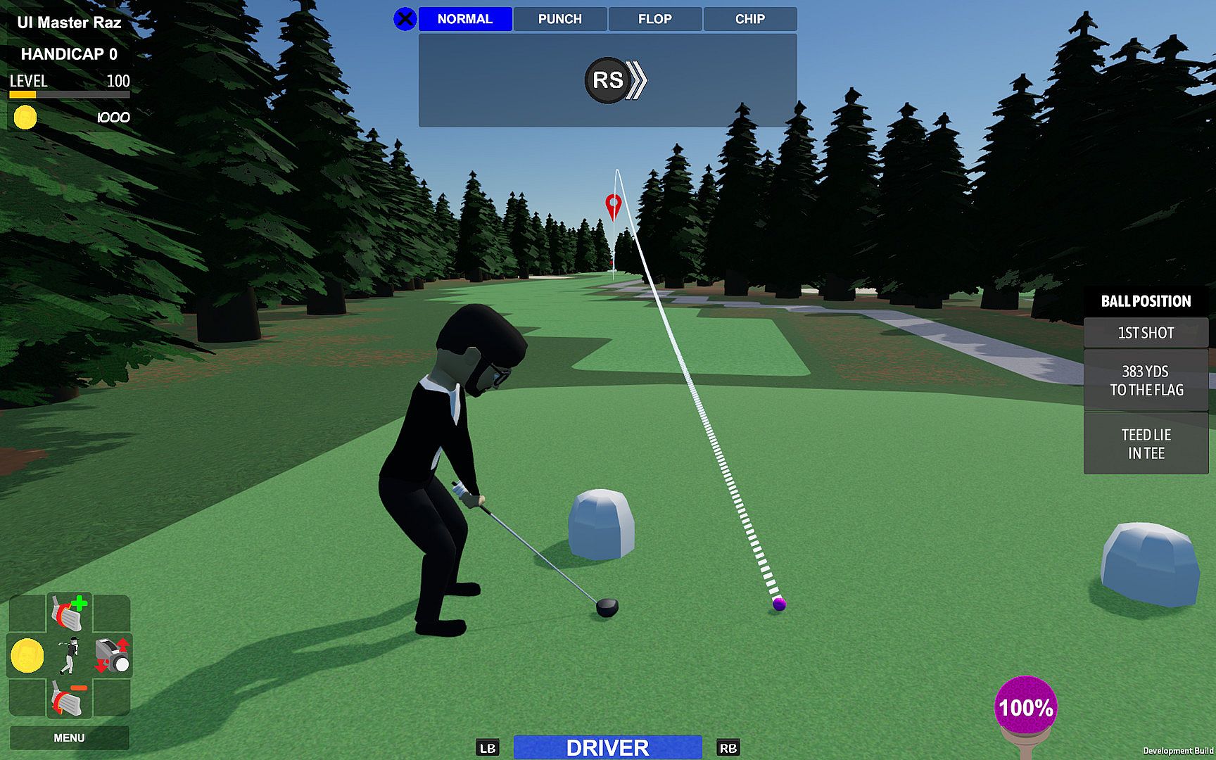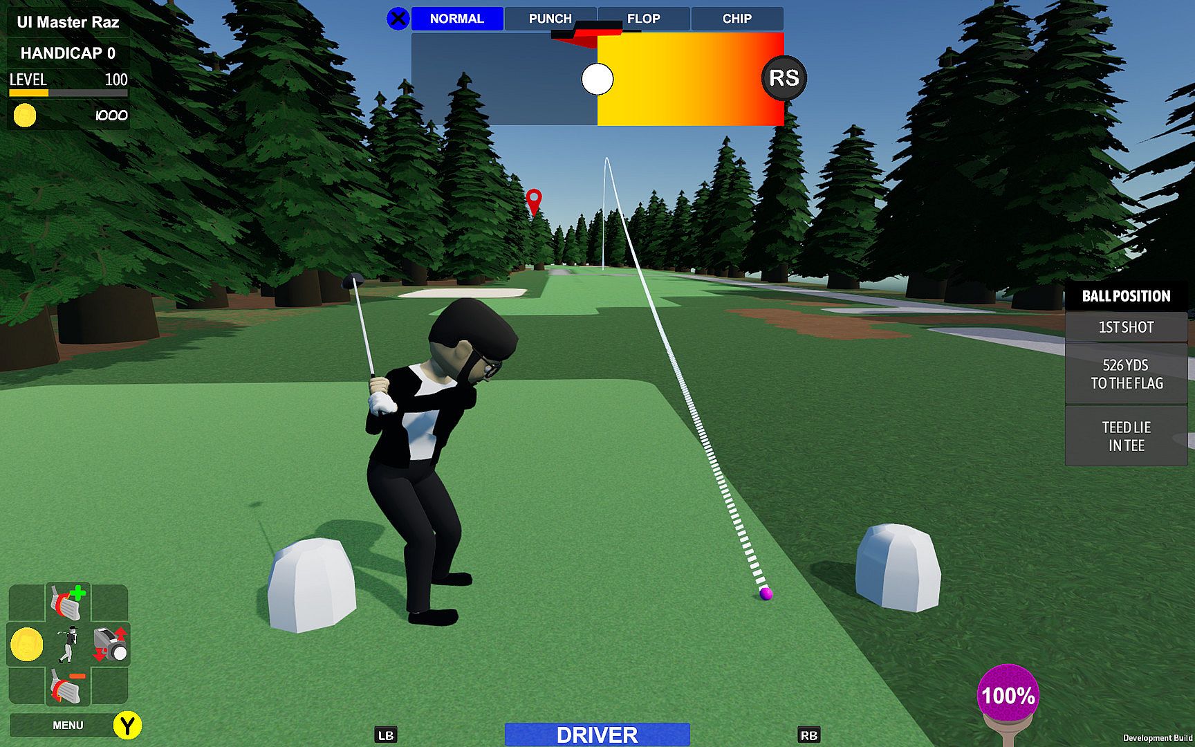 As a player, you are given all the tools you need, but must make the decision on what kind of shot (normal, punch, flop, chip), how to shape it (hook, straight, slice), and how hard to hit it. The game will not tell you any more than recommending a club to use. So lineup and take a few practice swings to determine your plan of attack. Practice swings will update the estimated shot trajectory, allowing you to determine if your current approach is going to work. Then it is up to you to replicate your practice swing once addressing the ball. And if you mess it up, hopefully you have one of your Mulligans available to redo it.