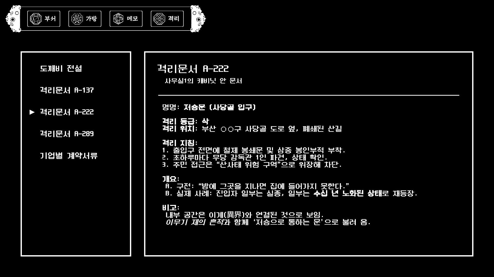 〈Mumyeonggjrokbu〉 is an urban fantasy isolation novel born from this imagination. It reinterprets Korean folktales, myths, dokkaebi lore, and ghost stories through the lens of a modern isolation narrative. Weaving together past and present, this work creates a multilayered world where players confront the precarious balance between humans and supernatural beings through investigation and documentation.
