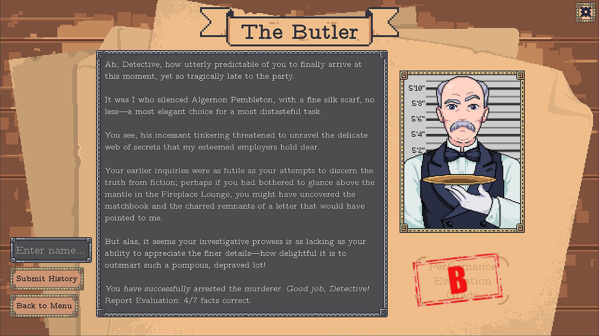 AI-Powered Suspects: Engage in realistic, text or voice (experimental, weekly limits apply) conversations with dynamic AI characters, each harboring distinctive personalities, motives, and hidden truths. Every word matters!