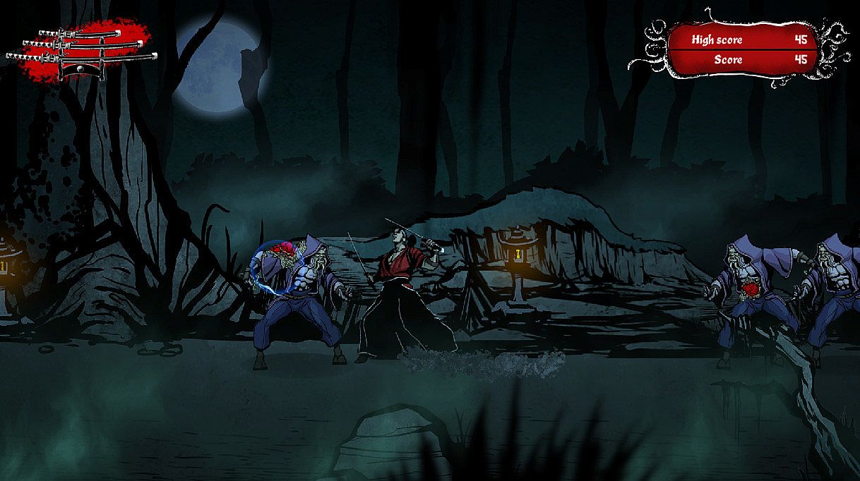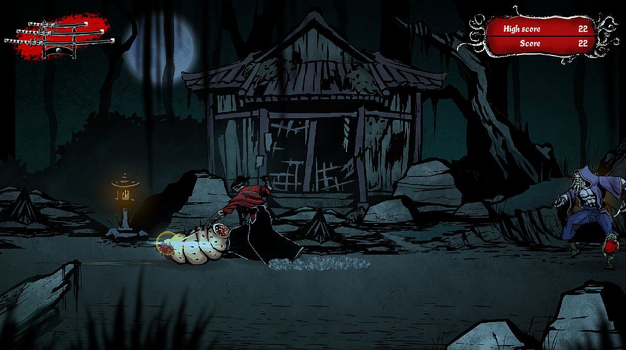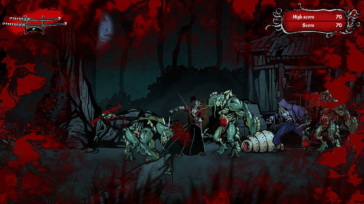 The ronin is a victim of a terrible curse that makes him a target for unspeakable monsters. In each match, hordes of monsters spawns endlessly and attack until there's no one standing. The enemies comes from both sides of the screen and must be attacked with precise blows to bulging weak spots shown in their bodies. Challenge your friends to see who is the coldest and most precise warrior, even when facing impossible odds.