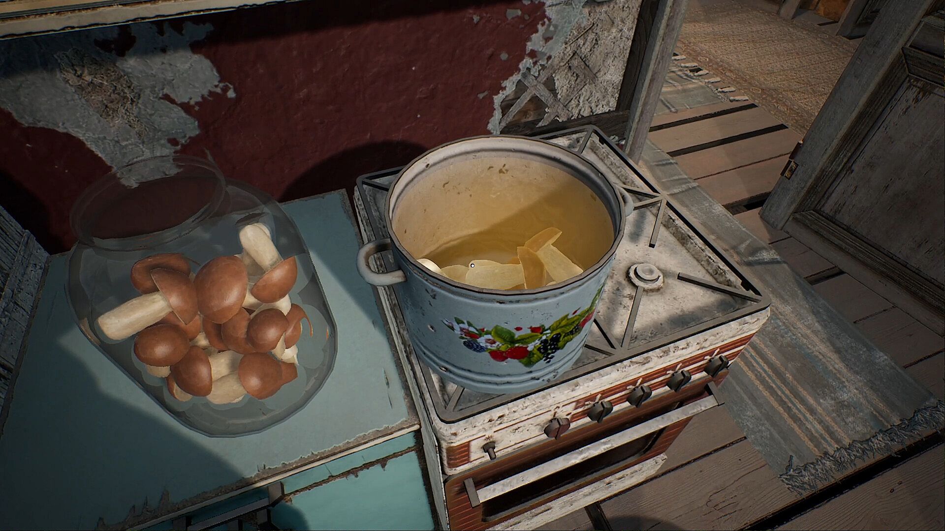 Chop firewood, light the stove, and dry mushrooms over the coals.