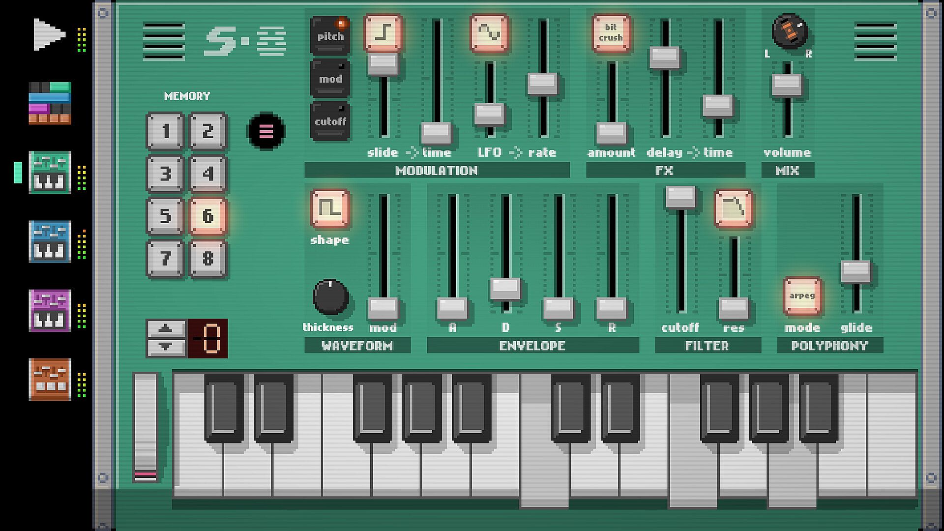 You will follow the evolution of computers, synthesizers and digital music. After starting with a limited feature set suitable for chiptune music, you will progressively unlock new features like filters, additional tracks, FM synthesis, wavetables, new modulation capabilities, sampling…