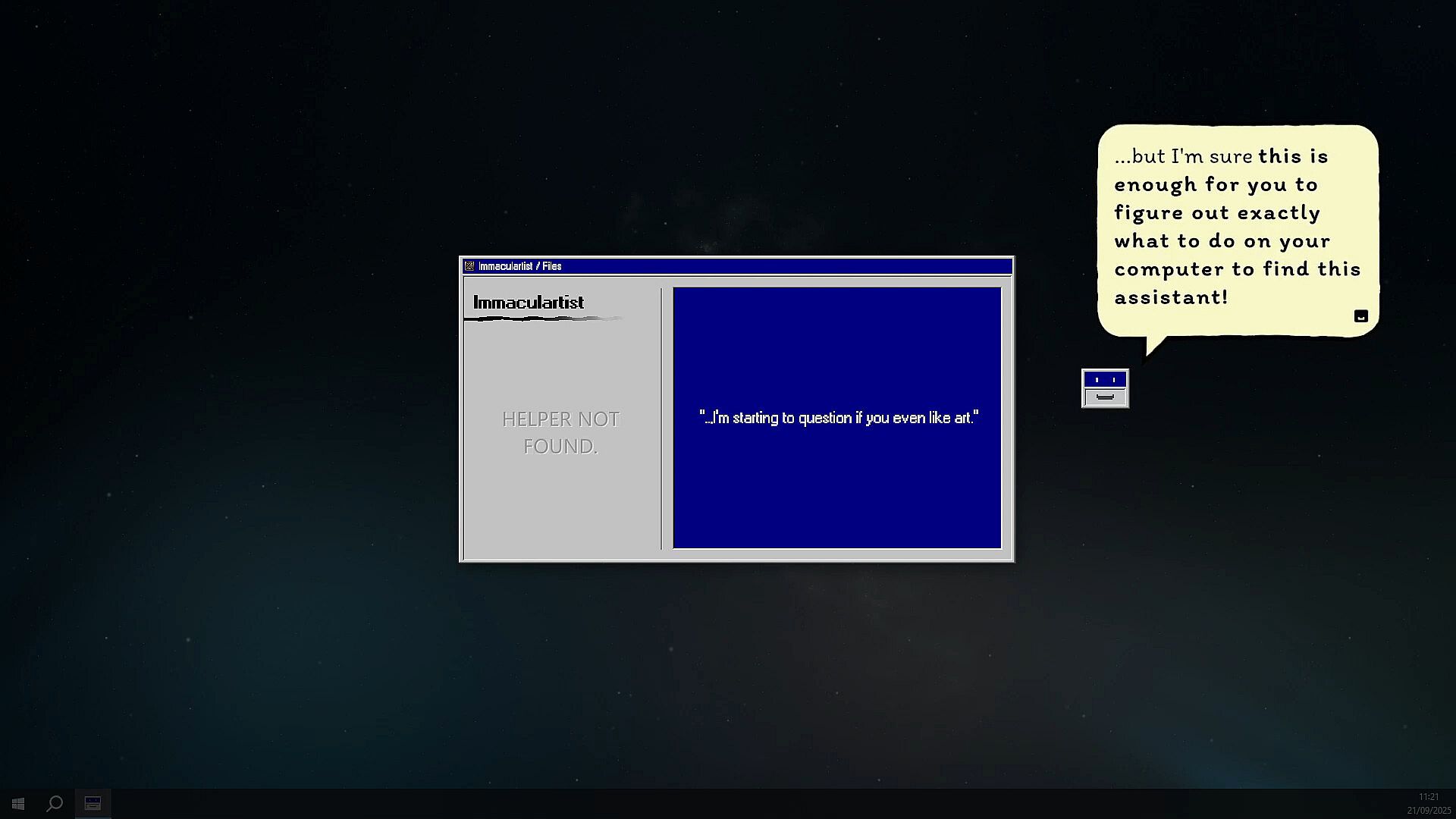 My Helpers is an experimental horror game that hides a group of virtual… "assistants" inside your machine. FIND THEM by combing through your real files, exploring weird applications, and using your computer in ways you may have never expected - and remember: this is just a game.