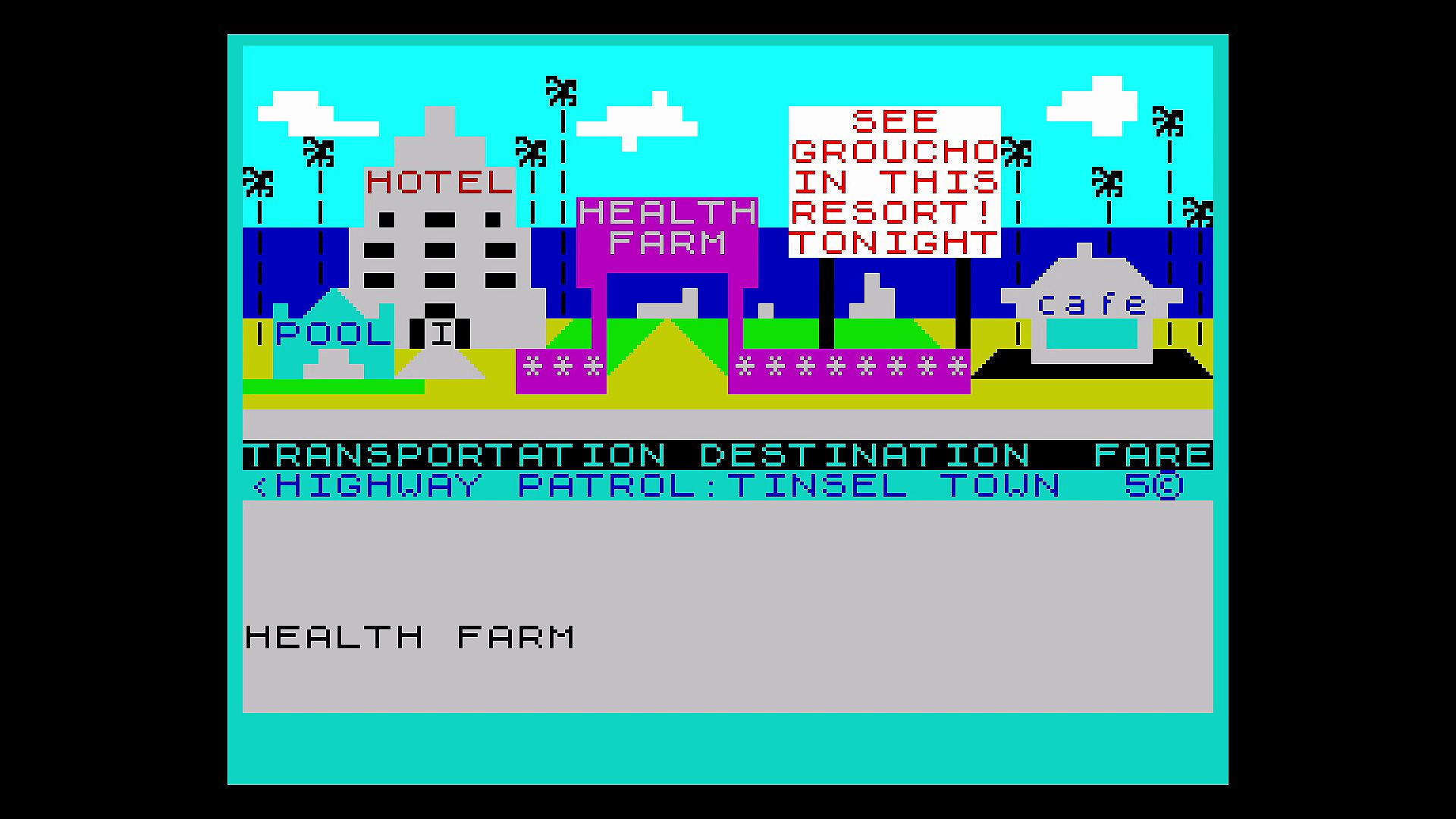 Using simple text commands, move around Hollywood searching for Groucho and his friend the Piman. Fat cigars are your currency, and can be won by doing things like gambling at a casino or betting on horses. Finding Groucho gives you chances to have hints revealed to you about a certain celebrity figure. When this game was originally released, players could send in their mystery celebrity name guesses to the game's publisher, Automata UK, to be entered into a prize draw for a trip to Hollywood on Concorde! Unfortunately, players of this version will be a little late to the party, as the prize was already won back in 1984 by Phil Daley from Stoke-on-Trent.