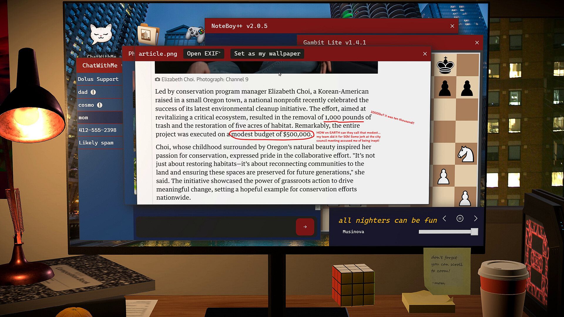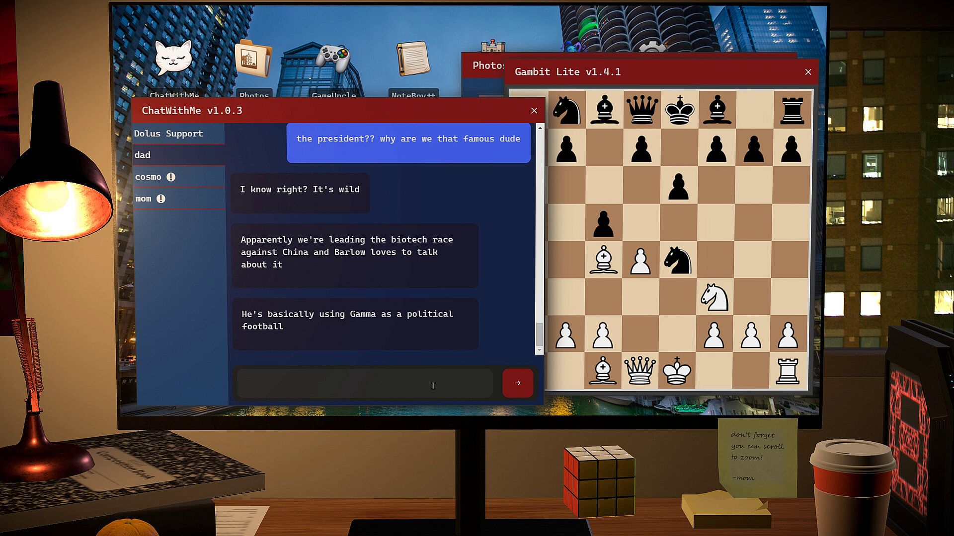 Arm yourself with valuable information by flipping through chats, photos, and whatever else you find. You’ll need to build your own sense of what matters and how to put it to use. And if you feel exhausted and you need a break- Well, why not invite a friend for a game of chess?