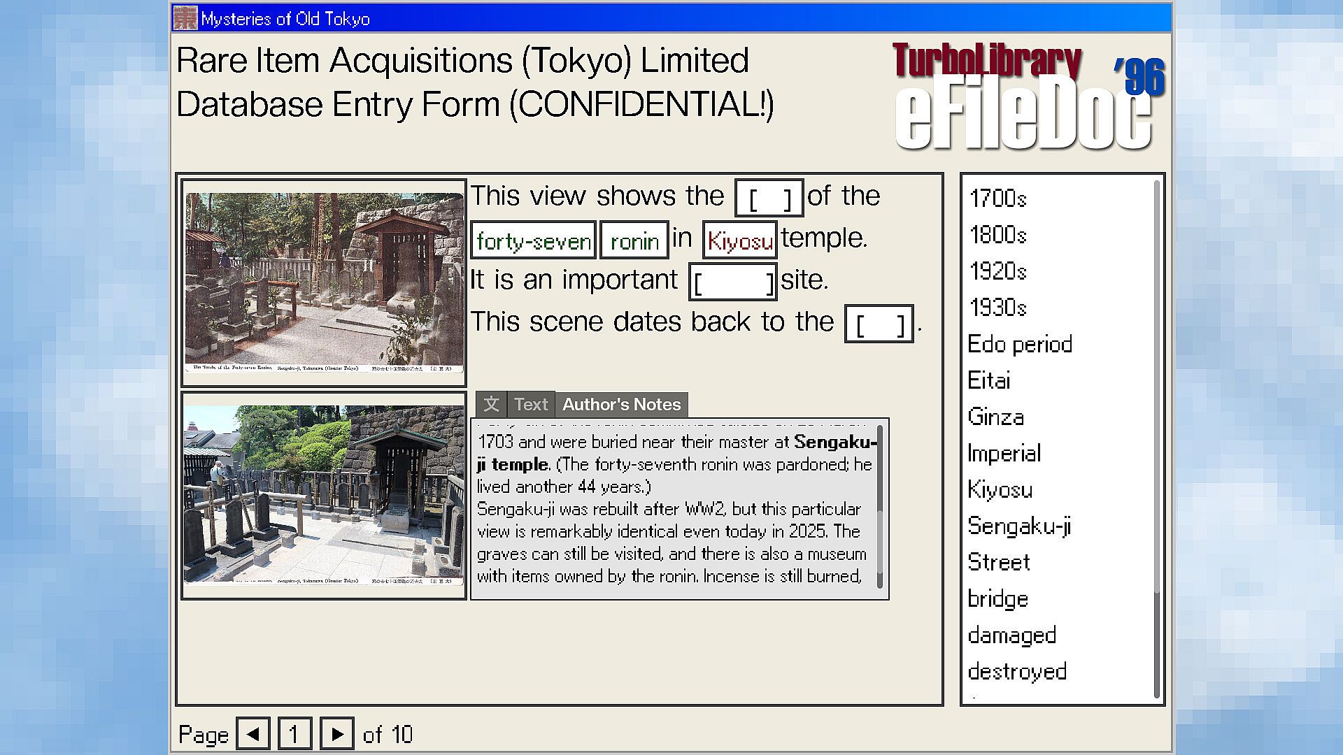 You’ll fill in the gaps for each postcard and help your mysterious employer create a detailed database of Tokyo’s history, all based on real historical sources.