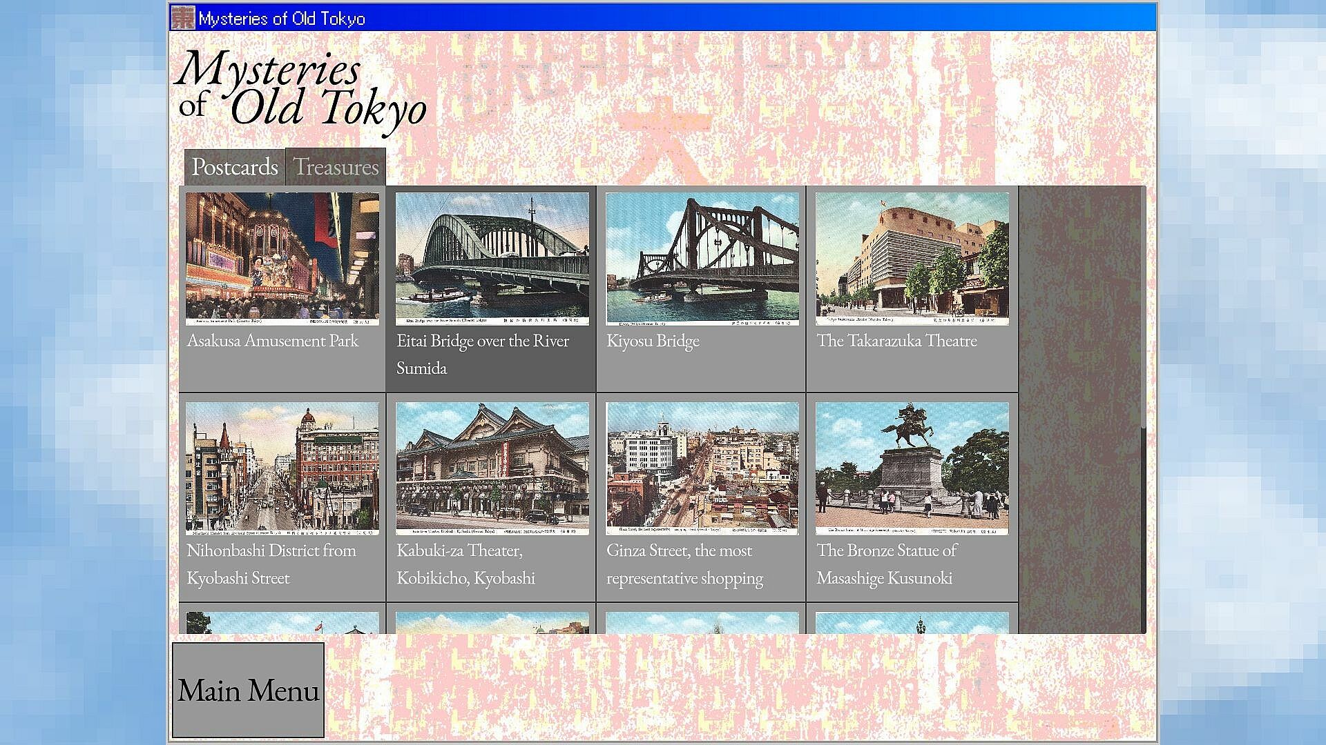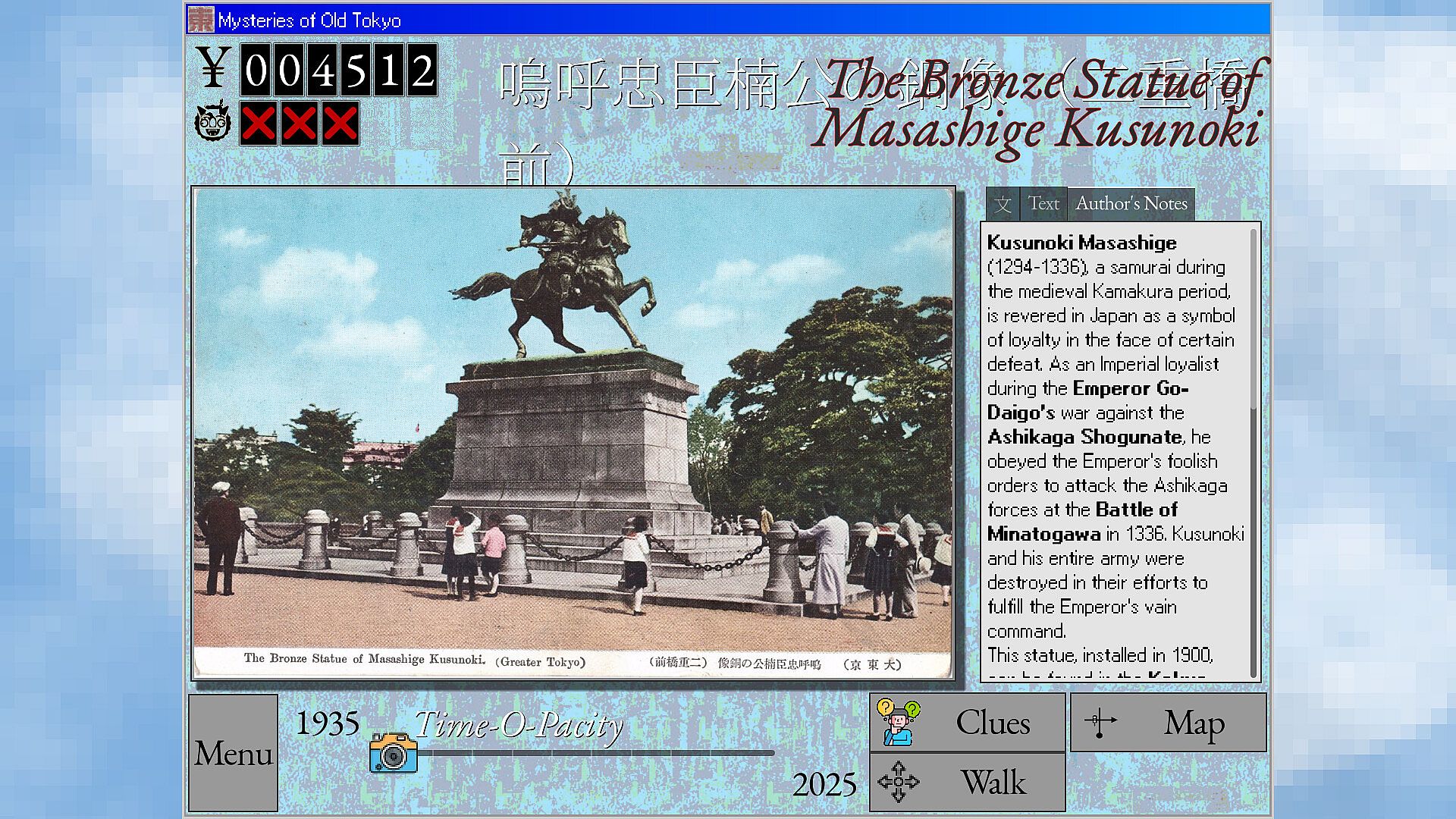 Mysteries of Old Tokyo is inspired by the CD-ROM "multimedia experiences" of the 1990s like Encarta '96 and Cosmology of Kyoto, as well as modern detective games like The Roottrees are Dead and the Golden Idol series.