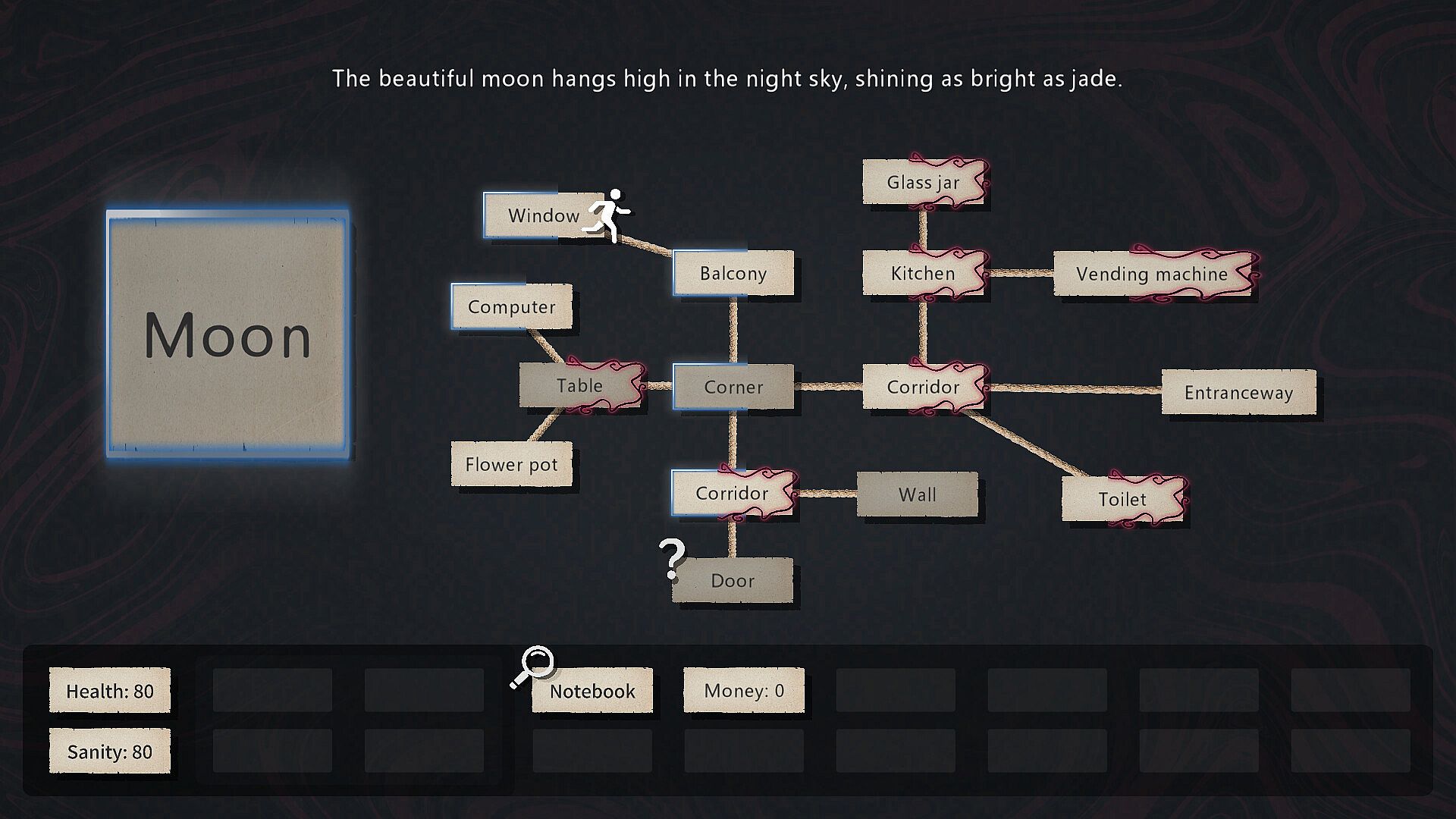 Explore the world by clicking on nodes, and interact with the world using items to solve puzzles. Understand the behavior of ghosts and urban legends by reading the rules, analyzing their weaknesses, and finding a way to survive through the correct actions. Live through a world filled with dangers and crises.Store your progress until you find the most hidden truth of the story.