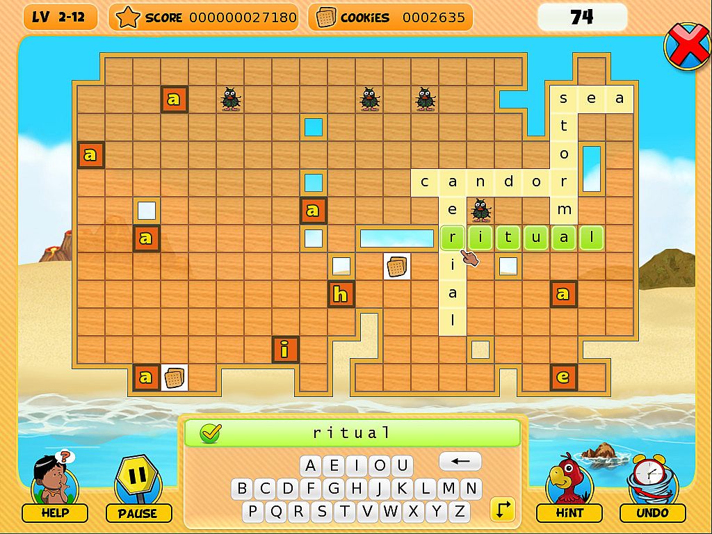 • Vulcania Island: Vulcania’s boards contain bugs! Hopefully, not "programming bugs," but little creatures on cells of the board. We have to surround those bugs with letters, and also catch all of the mystic letters.