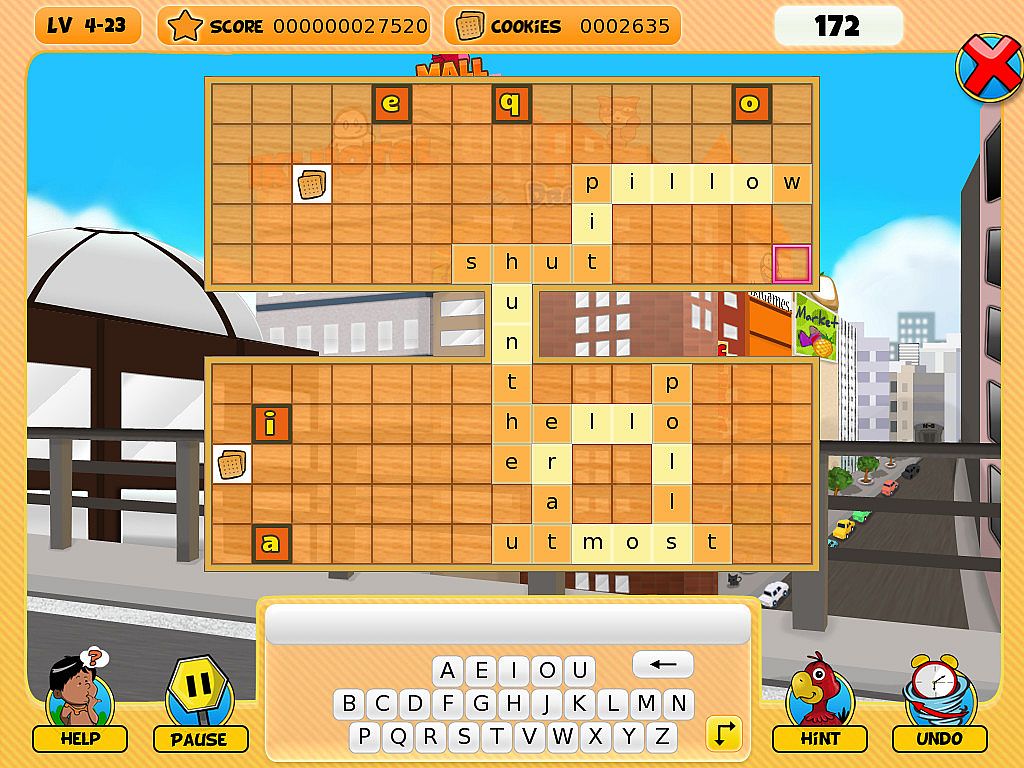 • Type a word with your keyboard. If the word is accepted by the game's dictionary then use your mouse to place the word on free cells of the board. Your word can overlap cells which are already occupied by a letter, but only if letters match. You can also use your mouse to type your word with the on-screen keyboard, but using a real keyboard is much faster.