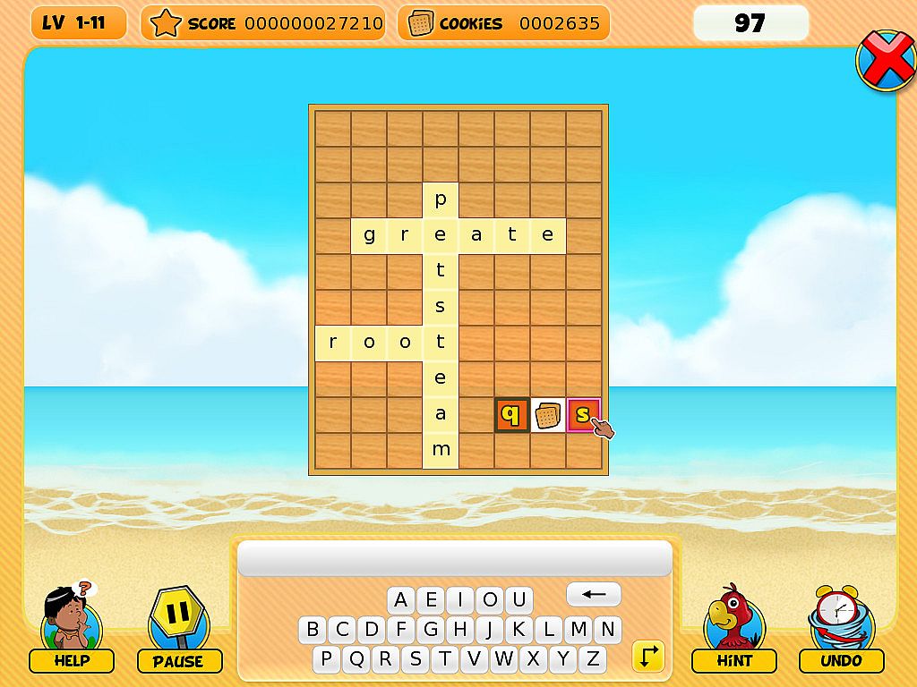 NagiQ is a family-friendly word game. In NagiQ you think of English words and place them on a board, vertically or horizontally, trying to connect your words with some special, mystic letters already placed on the board. There are more than 100 levels grouped into 5 islands, and each island introduces variations to the basic gameplay: