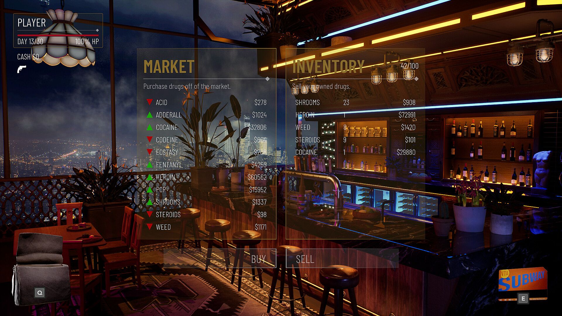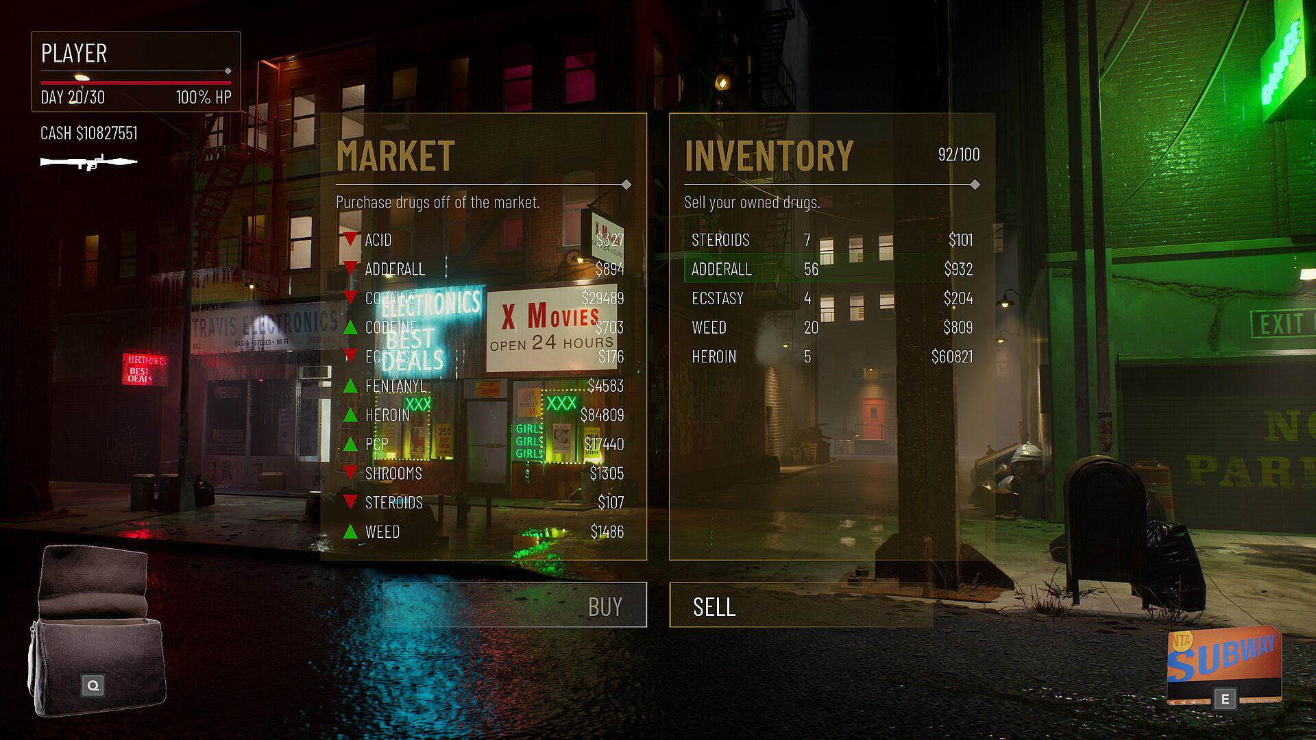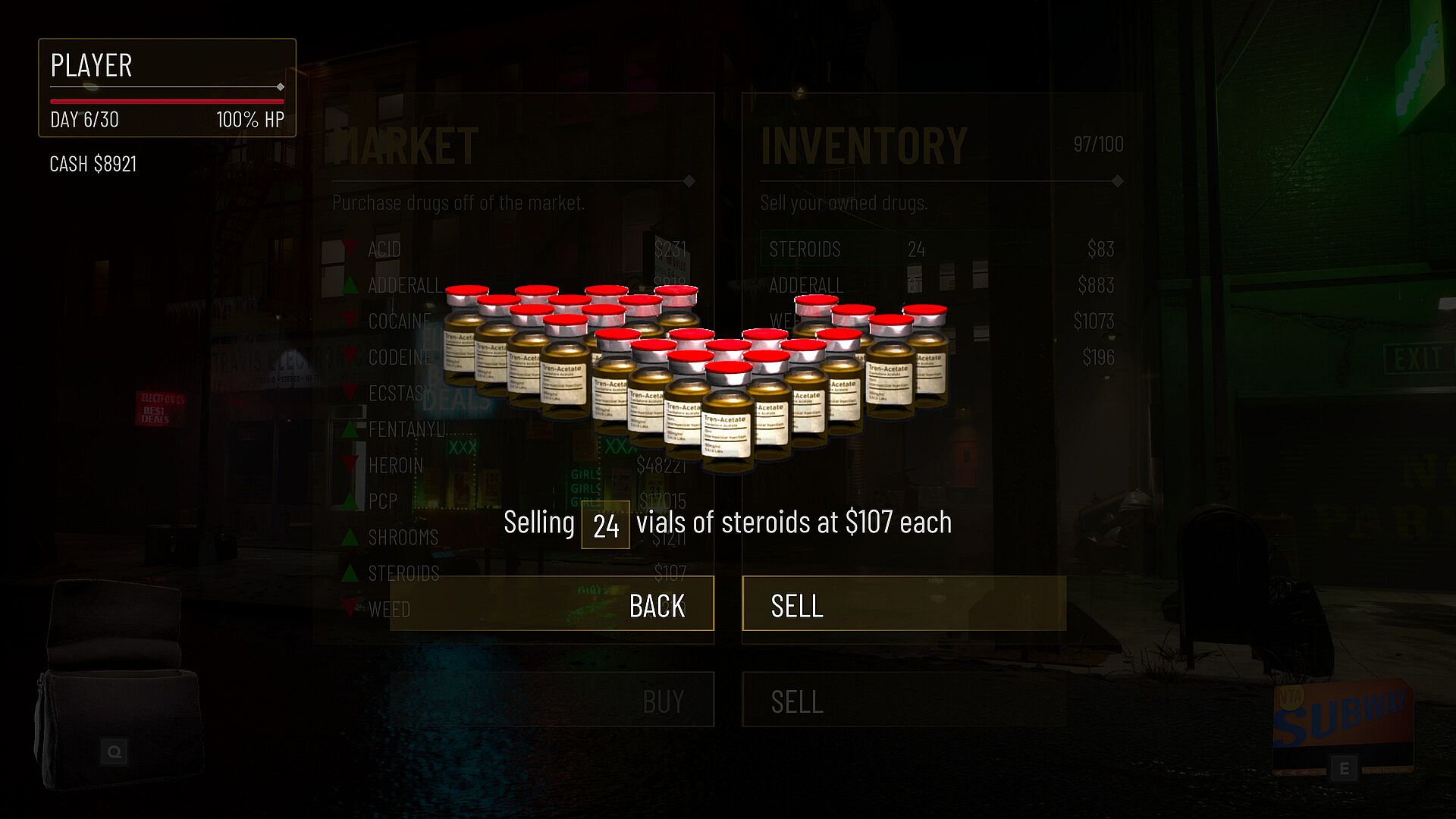 What are you selling? Everything from LSD, Adderall, Cocaine, Codeine, Ecstasy, Fentanyl, Heroin, PCP, Shrooms, Steroids, to Weed. Buy in bulk at low prices, sell high, and see your wealth skyrocket. But remember, the name of the game is subtlety. Keep your operations under wraps, stay on top of market trends with your beeper, and make sure you don't get busted.