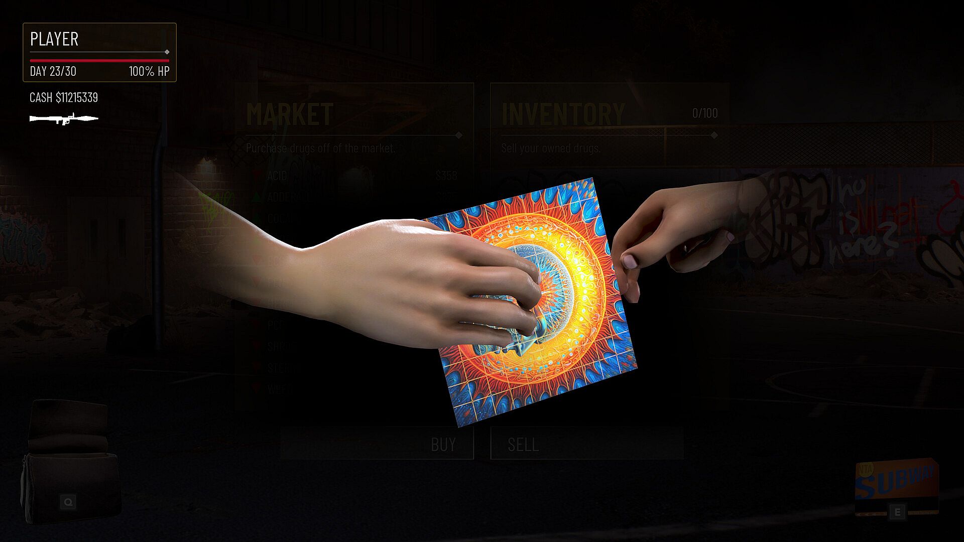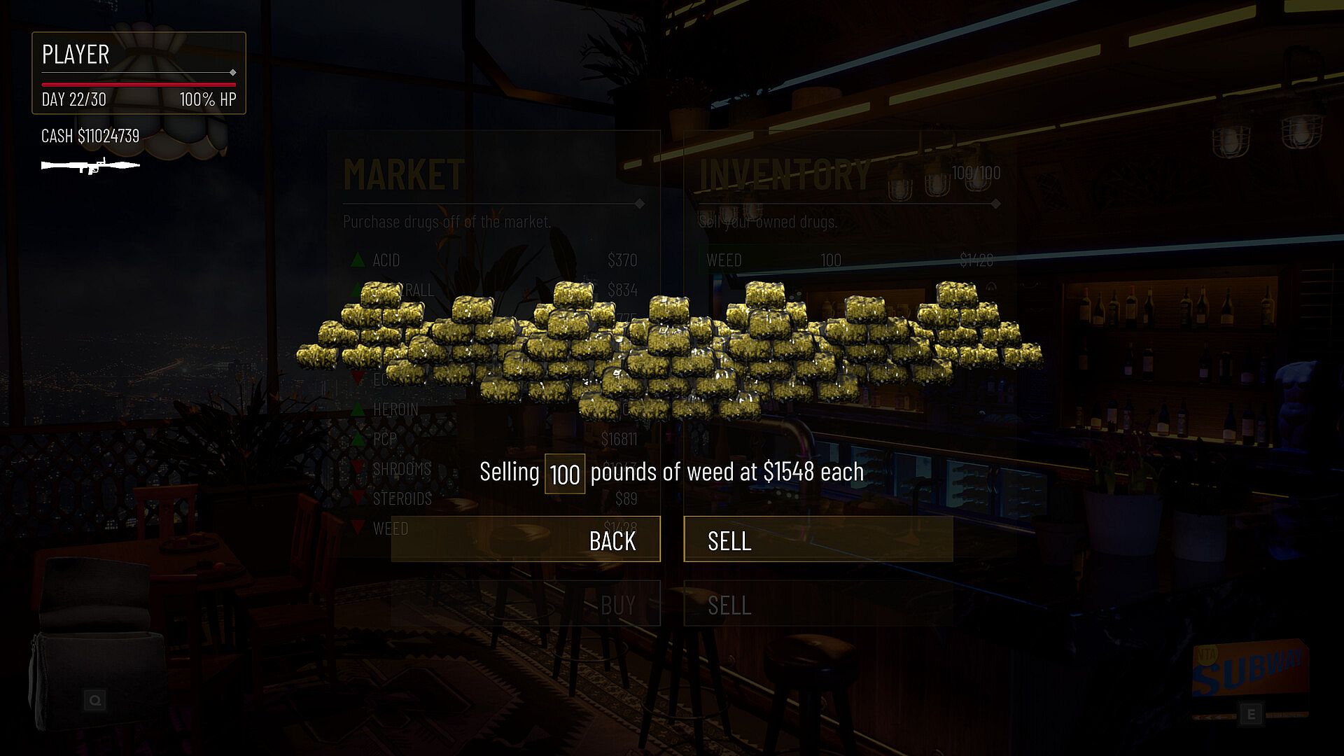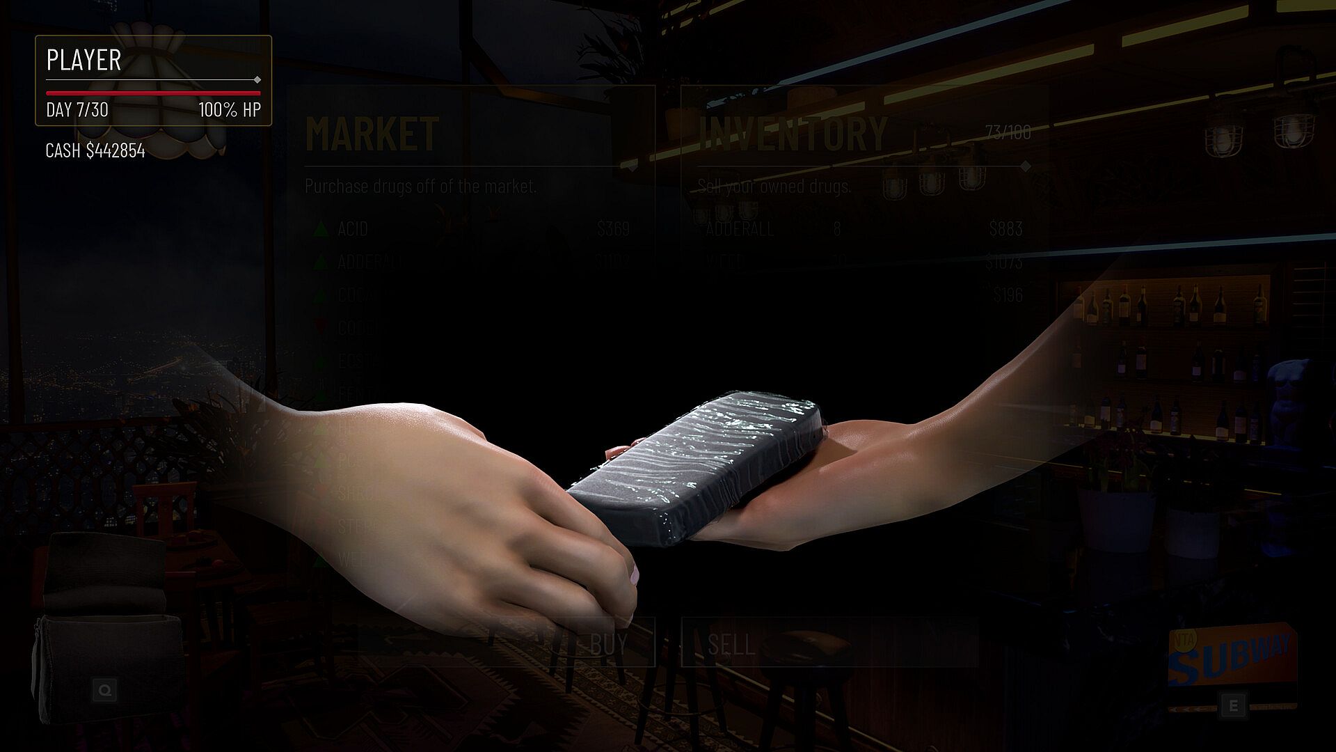 What are you selling? Everything from LSD, Adderall, Cocaine, Codeine, Ecstasy, Fentanyl, Heroin, PCP, Shrooms, Steroids, to Weed. Buy in bulk at low prices, sell high, and see your wealth skyrocket. But remember, the name of the game is subtlety. Keep your operations under wraps, stay on top of market trends with your beeper, and make sure you don't get busted.