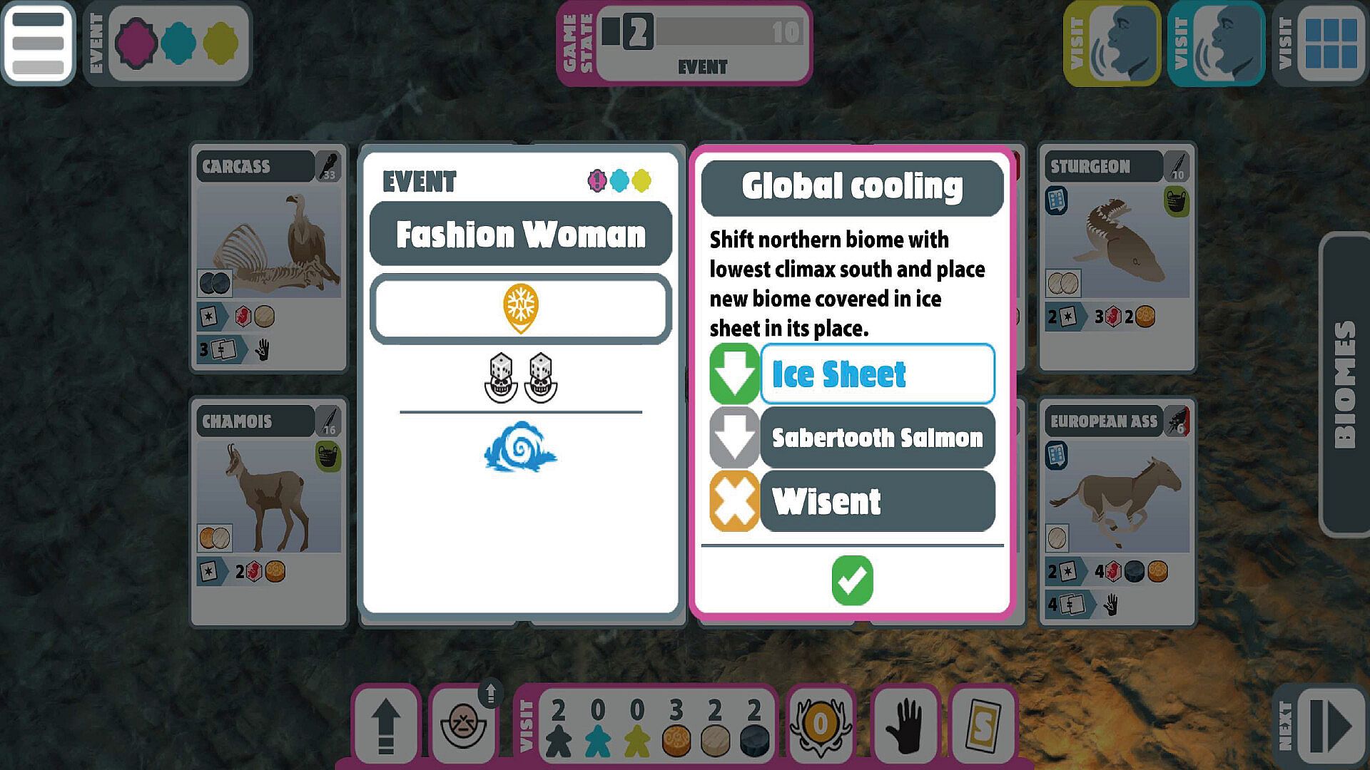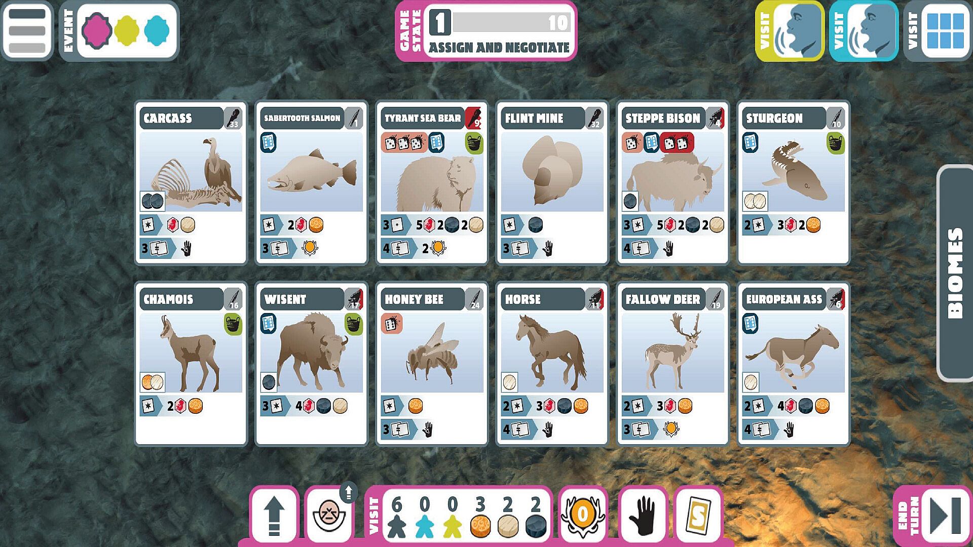 2. HUNTER ASSIGNMENT. All players assign their unassigned tribesmen to hunt biomes, become Elders, or perform courtships.