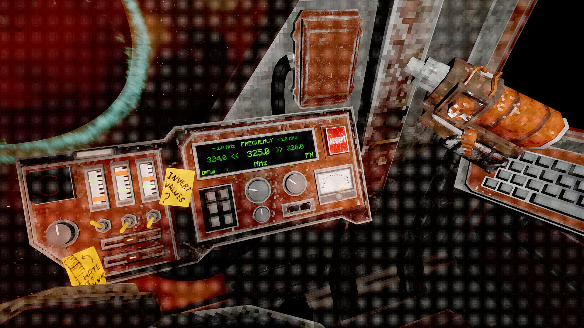 You were lucky. Unlike your colleagues, when the mothership collapsed, you happened to be in a fragile engineering vessel outside its hull. Now switches, sliders, screens, levers, and joysticks are your only means of interacting with the world around you - one wrong press could cost you your life