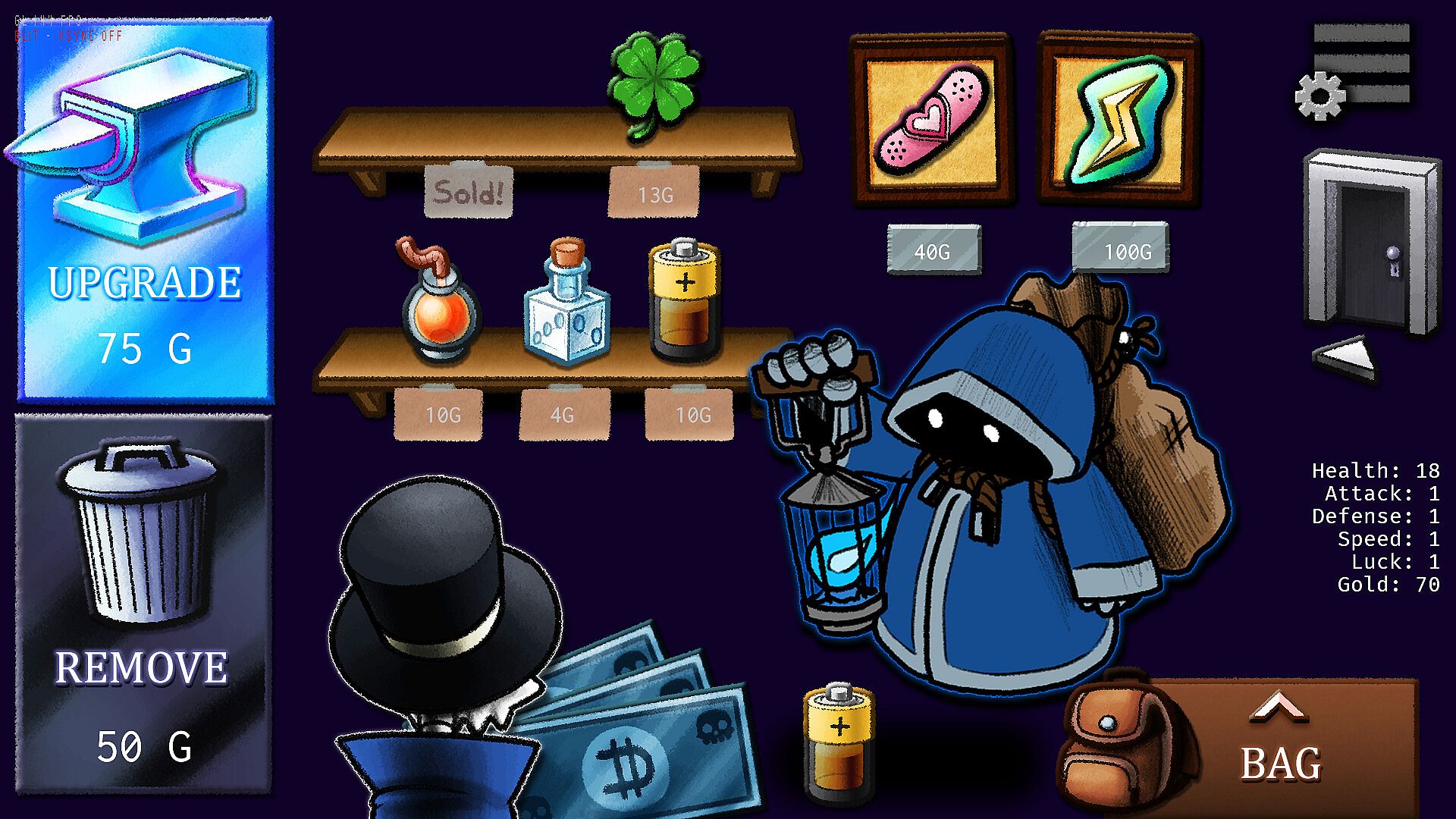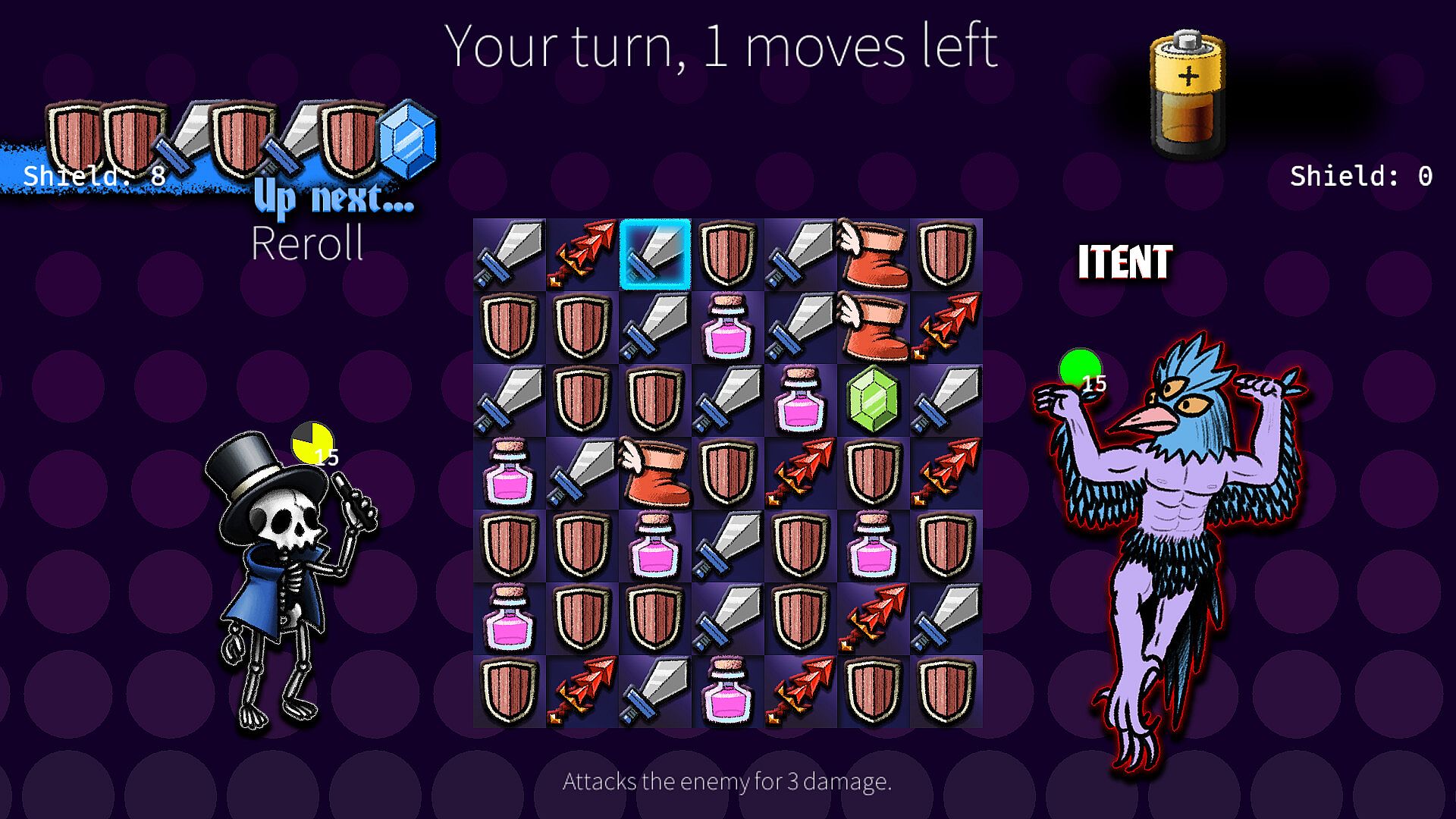 A match-3 rogue-lite! Traverse through multiple floors battling baddies and discovering secrets in every unique run. Along the way, build your arsenal of items, treasures and potions to help you along the way!