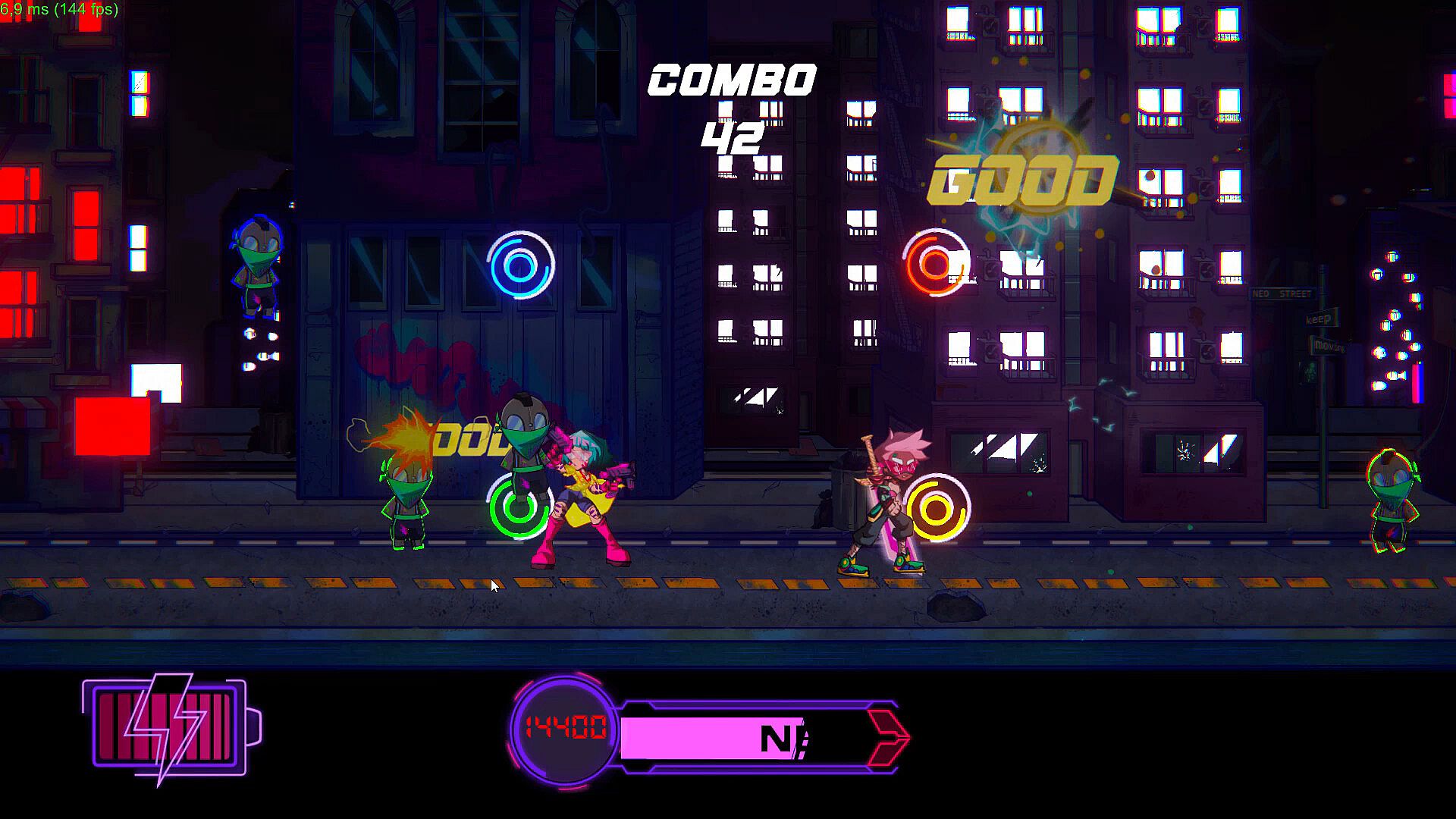 • Defeat enemies with the rhythm of the songs in the main game mode.