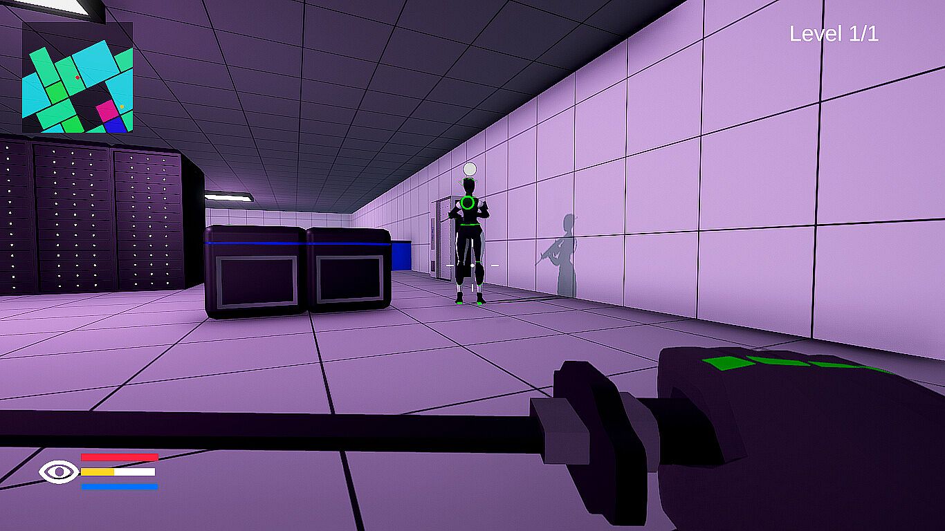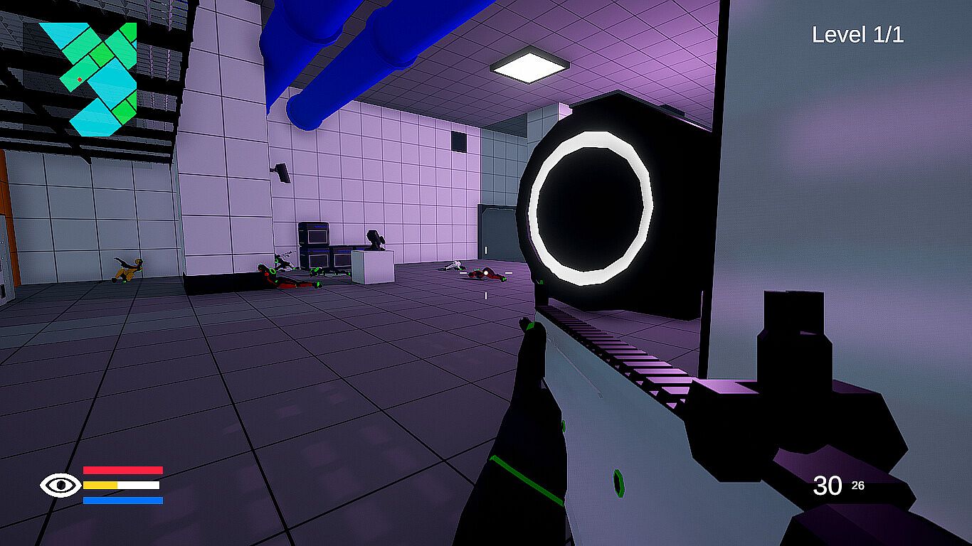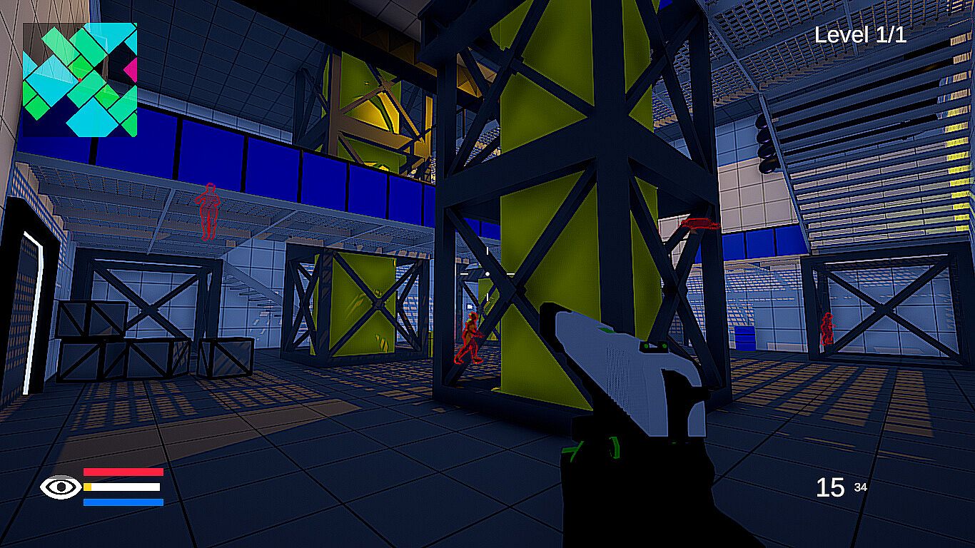 Neo Shock is an FPS roguelike. You play as a cybernetic character with various tools, shoot, stealth attacks, hack, or just throw a box in your enemies' heads.