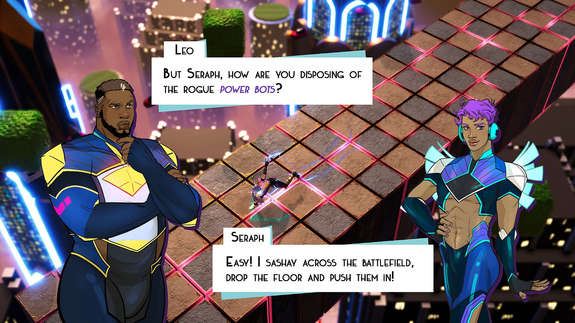 Explore a futuristic sky-city teeming with glitchy robots in NEON DEATH DROP, an action game about a gay go-go boy who must use his fierce dance moves to save the world.