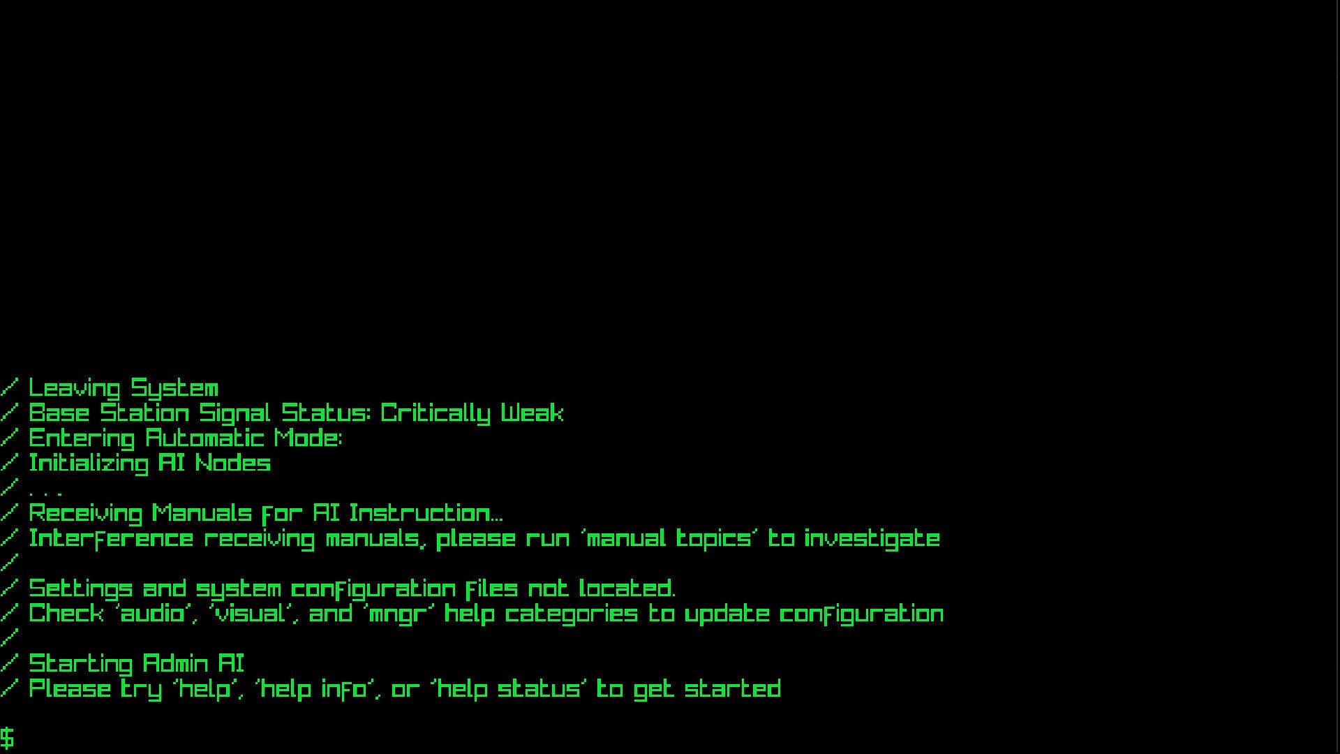 Administration A.I. will be woken up and terminal access block will be lifted once base station can no longer manually control satellite. The A.I. will have access to the satellite's internal status management, as well as the external camera system. The remaining systems (Ion Thrusters, Course Planning, Celestial Body Tracking, etc) will be given to separate A.I. Nodes and background processes due to their non-general intelligence need.Administration A.I. is an "Artificial General Intelligence" selected from the 5012th Generation of Neuro-Evolution Training. As A.G.I. stability and lucidness is notoriously difficult to maintain, skip commands and music has been installed within the satellite. The individual songs have been specially chosen due to stabilizing effects on similar A.G.I. systems.