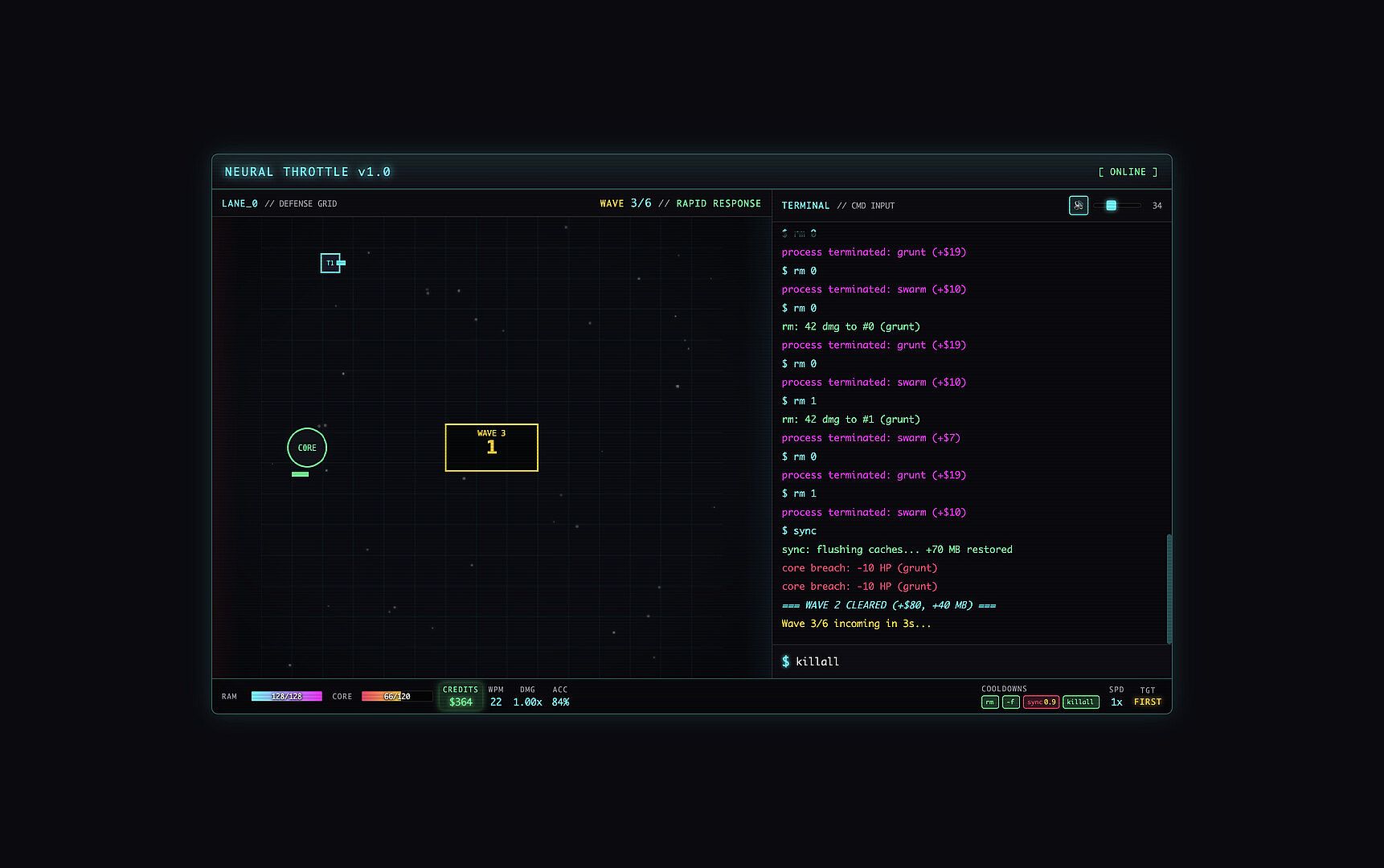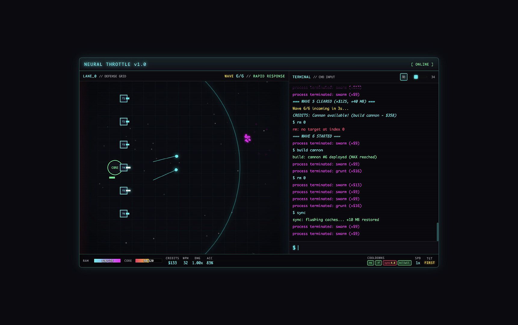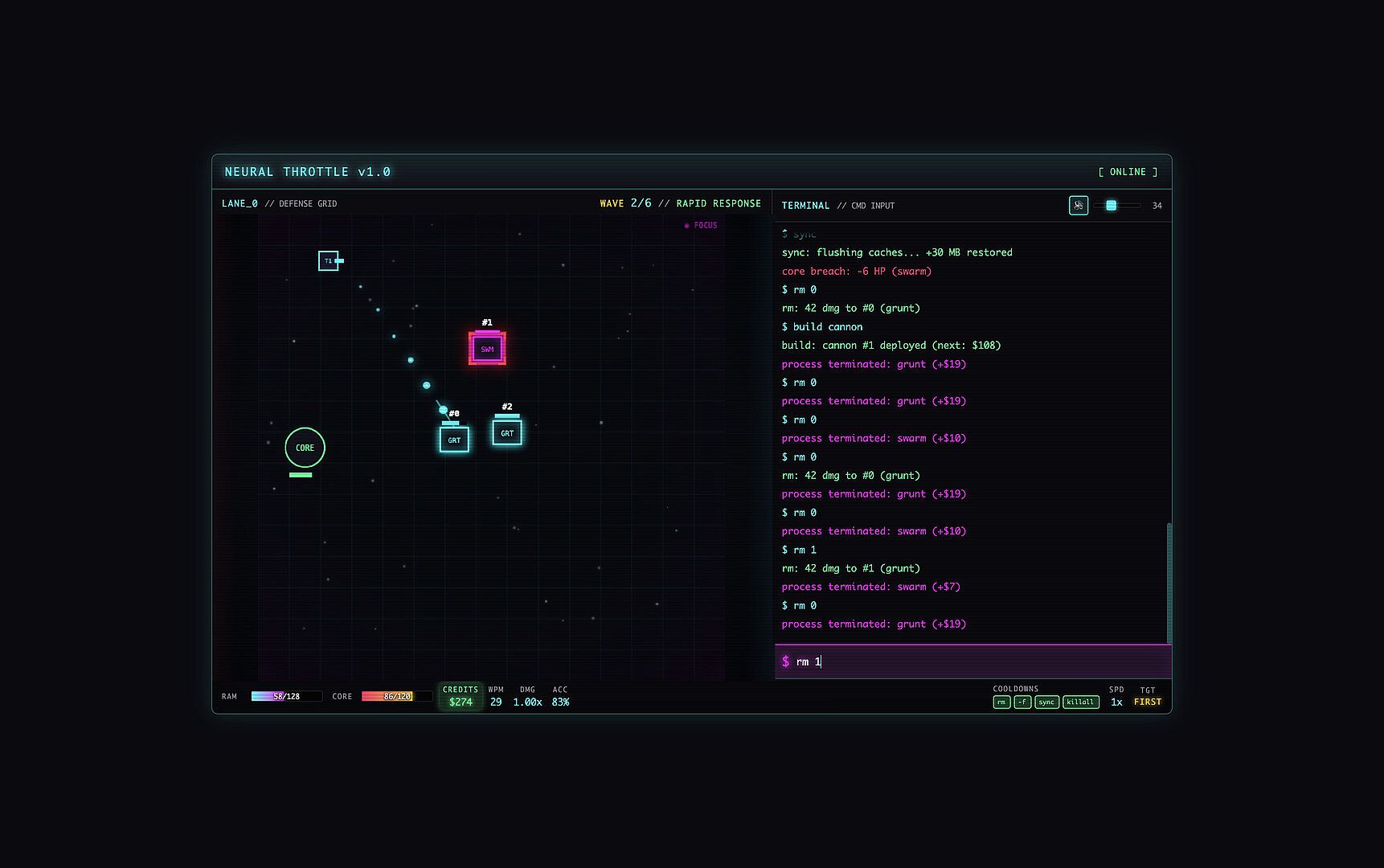 NEURAL THROTTLE is a fast-paced typing combat game wrapped in tower defense strategy. Every keystroke matters as you frantically type commands to eliminate waves of digital threats before they destroy your core.