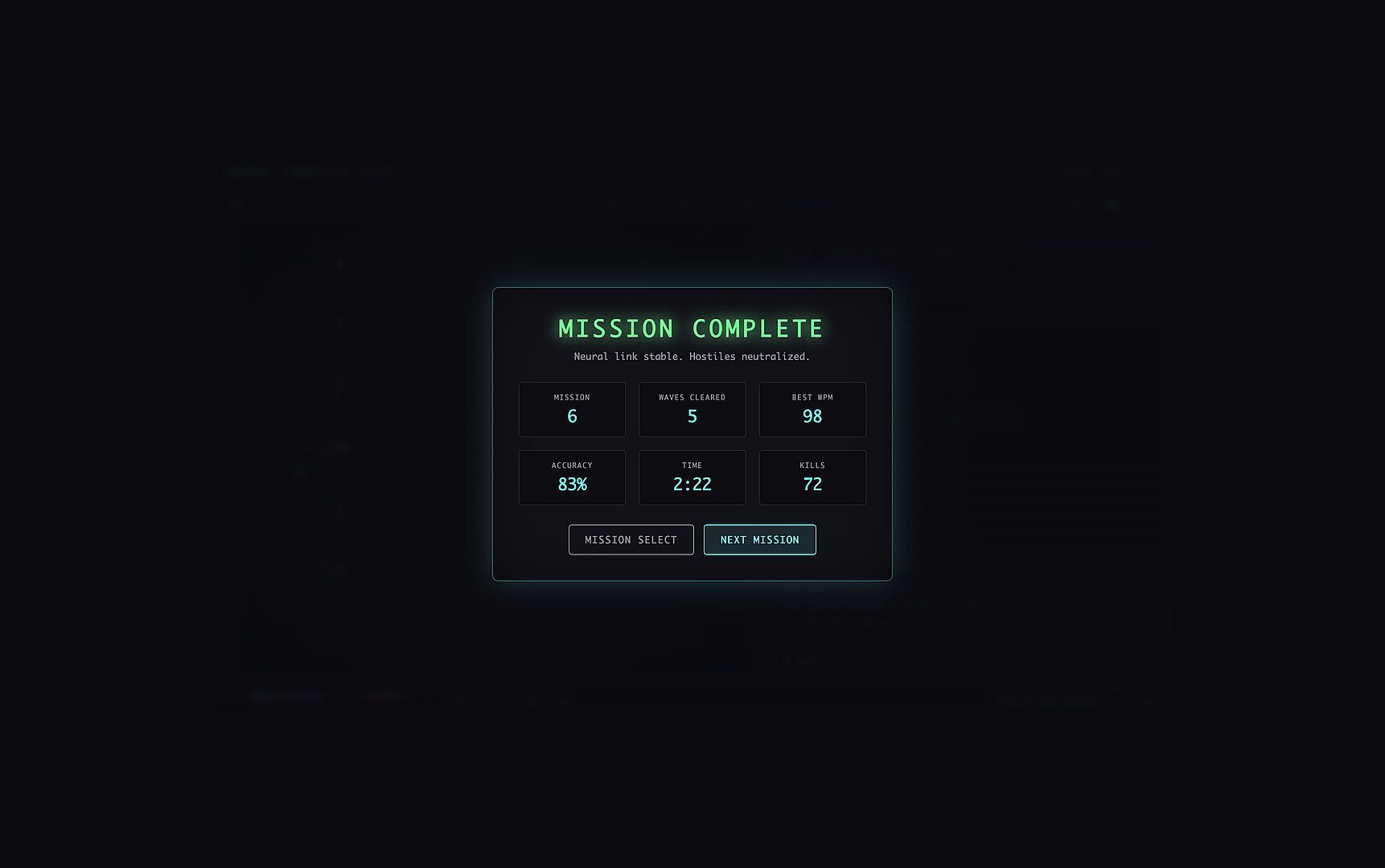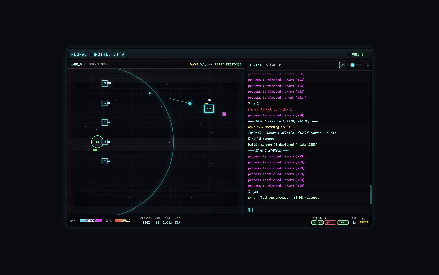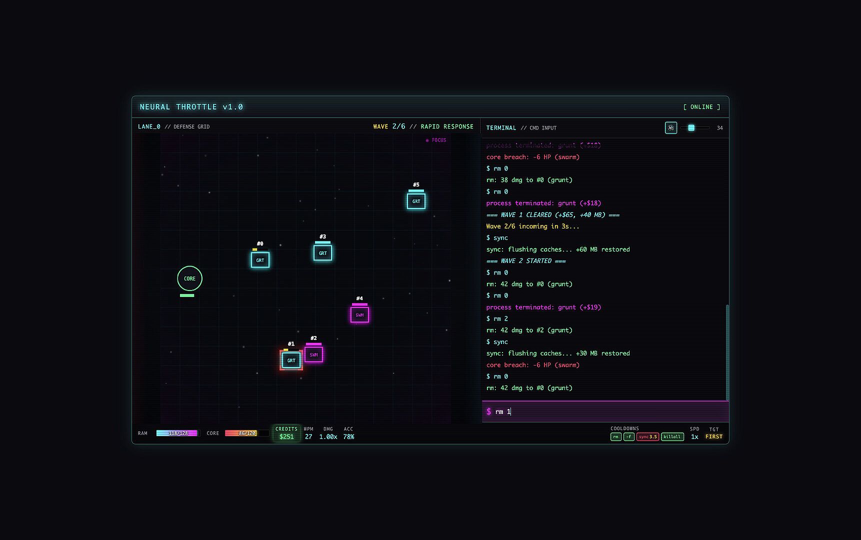 NEURAL THROTTLE is a fast-paced typing combat game wrapped in tower defense strategy. Every keystroke matters as you frantically type commands to eliminate waves of digital threats before they destroy your core.