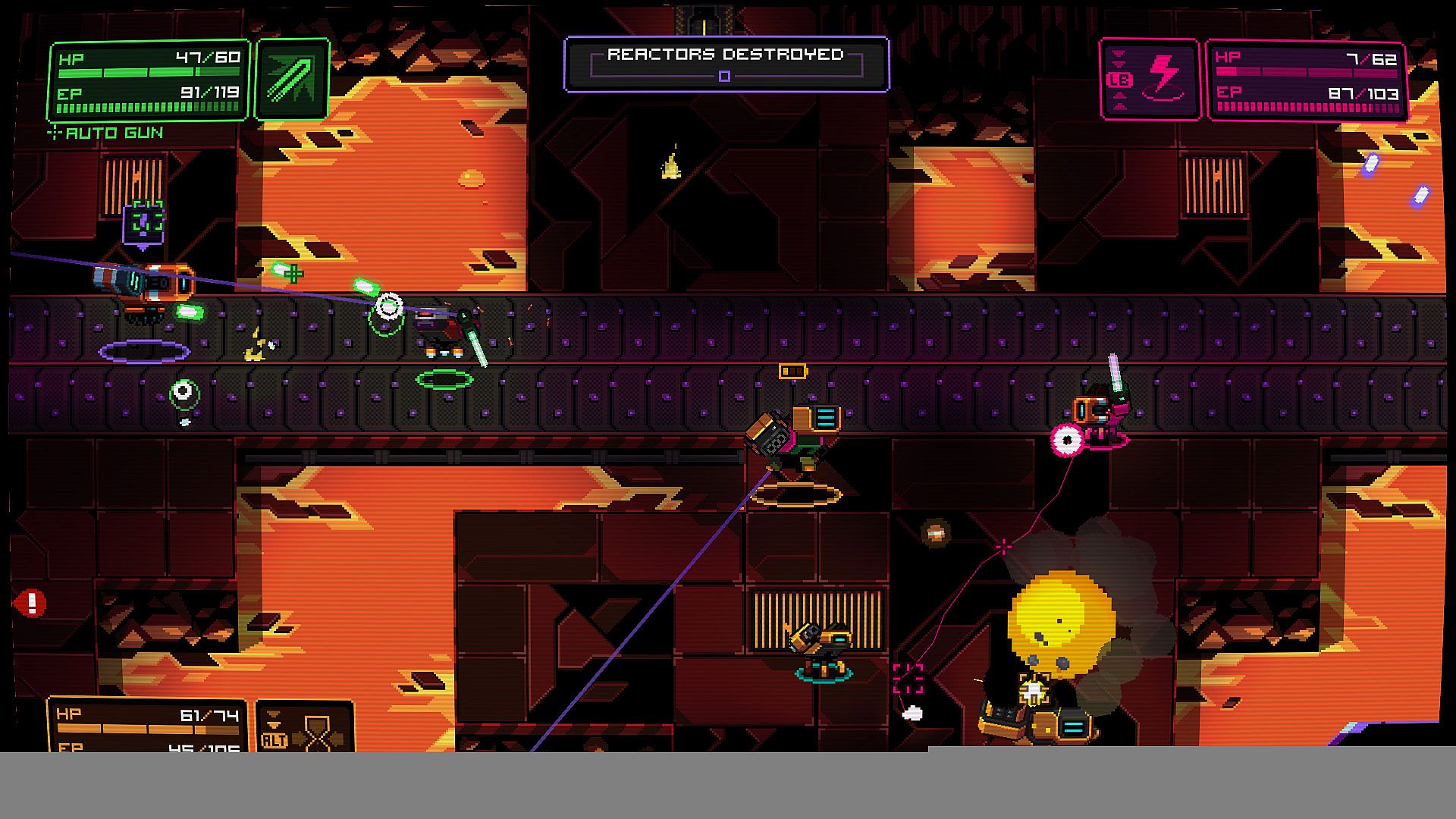 NeuroVoider* is a twin-stick shooter RPG set in a cyber futuristic world about brains shooting around evil robots with nuclear rocket launchers. Battle through the horde of vigilant robots, boost your character with the smoking remains of your victims, and defeat the master NeuroVoider to end this eternal war. Play it coop with up to 4 friends, or go alone in an adventure of hack'n'slash rampage, with a pinch of rogue-lite, and some permadeath.