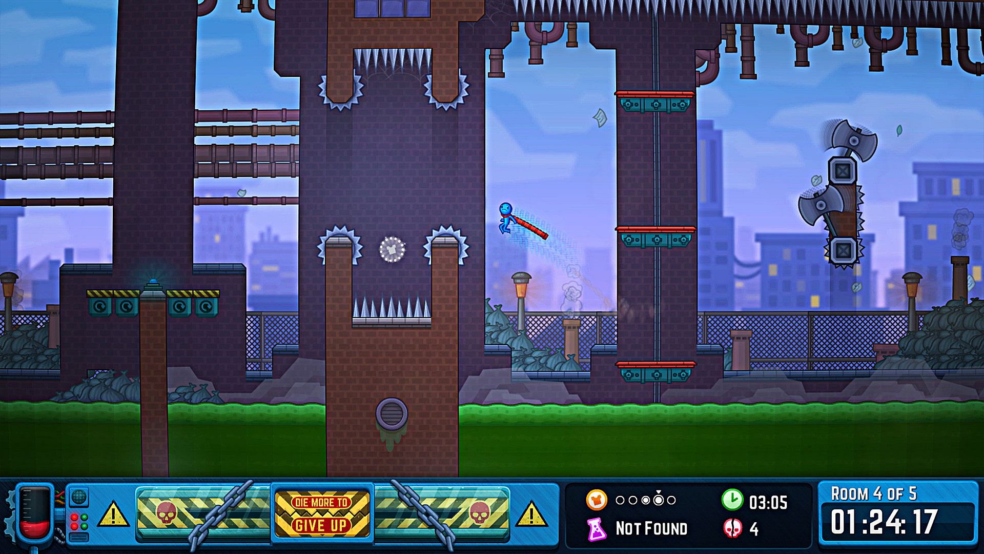 Never Give Up is a masocore, tough-as-nails groundhog day platformer where levels respawn with more obstacles and rooms until you survive the set or Give Up.
