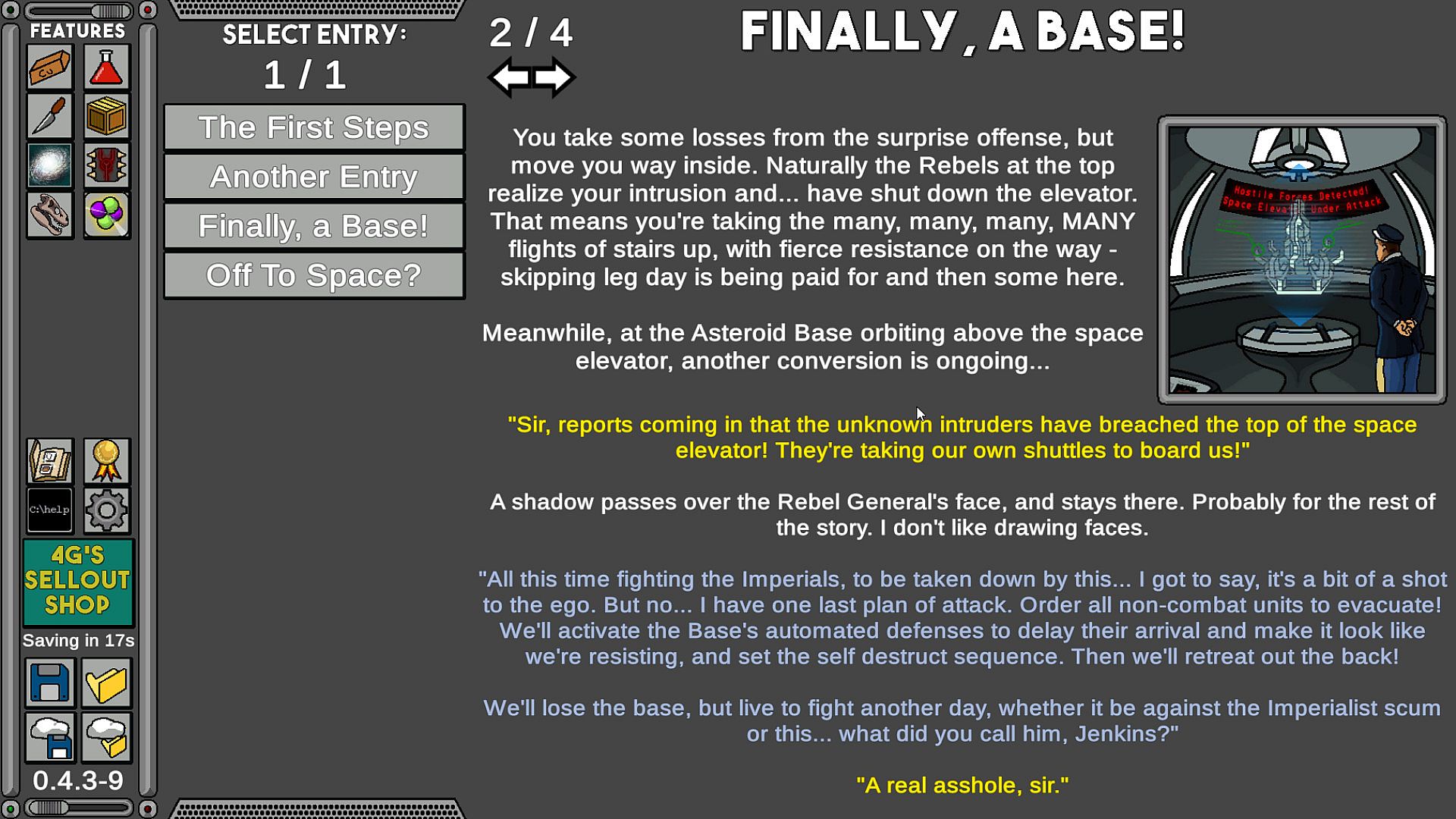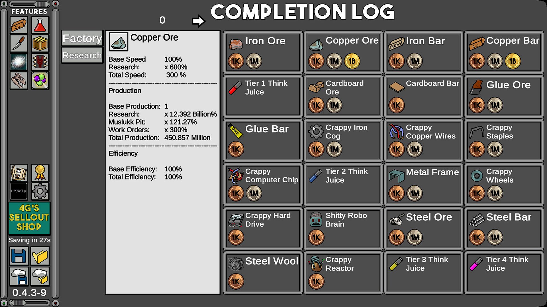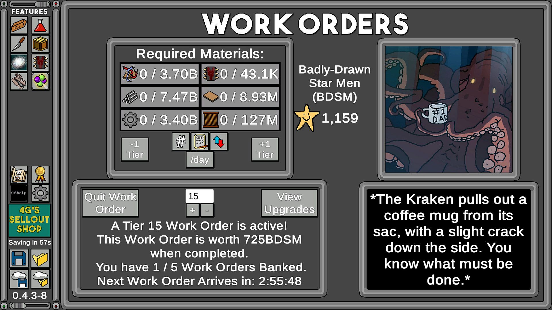 • Play around with a unfolding set of Features and resources that unlock as you progress! Complete Work Orders for customers to receive BDSM (oh my)! Use labs to research stupid topics to earn mysterious Elementium! Plant and breed crops that give you... stats! somehow!