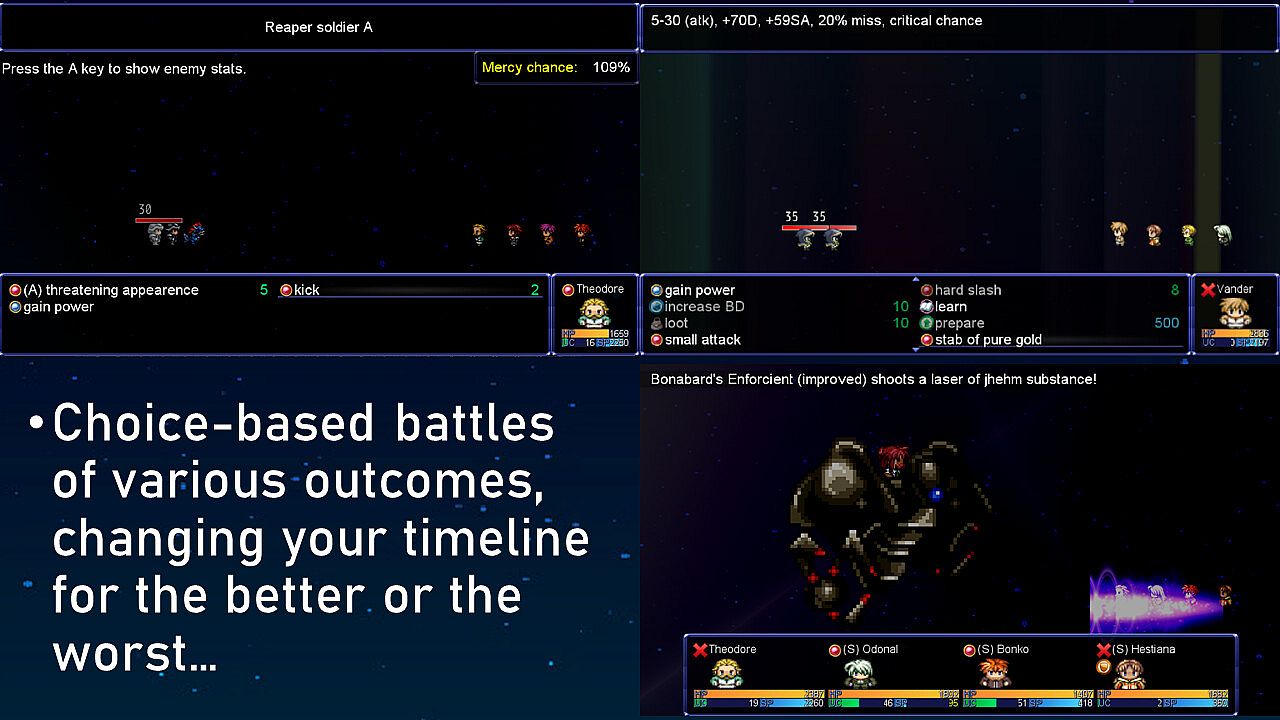 • Decide friend versus foe in a hectic turn-based combat system where every kill counts, each death affecting your timeline in various ways.