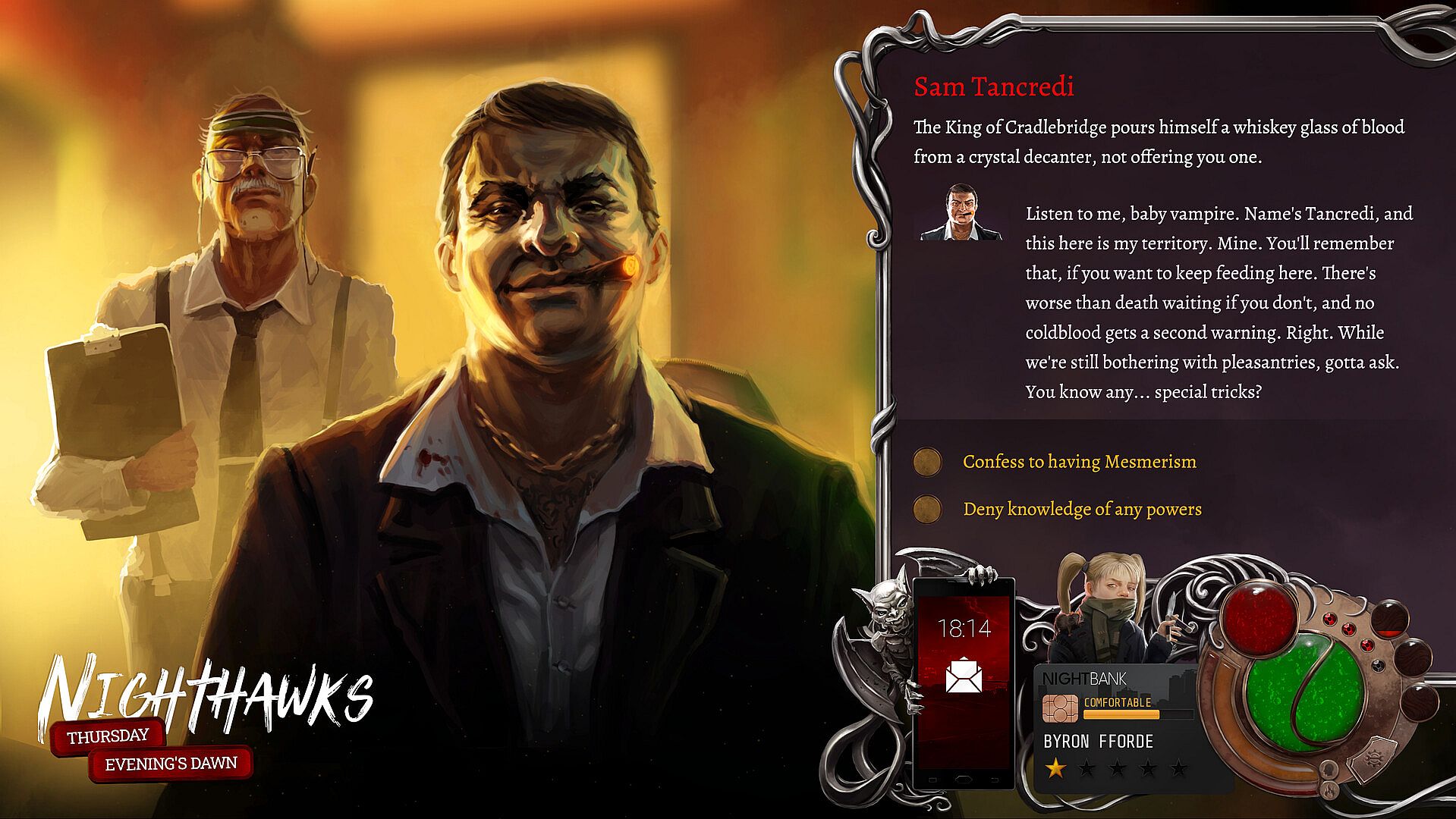 In Nighthawks, death is what you make it. Climb from rags to riches as a modern vampire in a city filled with horror and humour, embracing your dark instincts or proving to the world that even the darkest nights can lead to a brighter tomorrow. A bit of both, perhaps? Race against the sunrise while exploring a city filled with stories and opportunities, and meeting a fully-voiced cast of over 80 characters looking to make a fresh start in the modern nights. Turn your nightclub into a haven of found family and new beginnings, or simply your personal hunting ground. Fight to resist your predator instincts, or stalk the city streets in search of fresh prey. Either way, prepare to claw a path from the gutter to the heights of power and influence, until the fate of humans and vampires alike sits within your grasp.