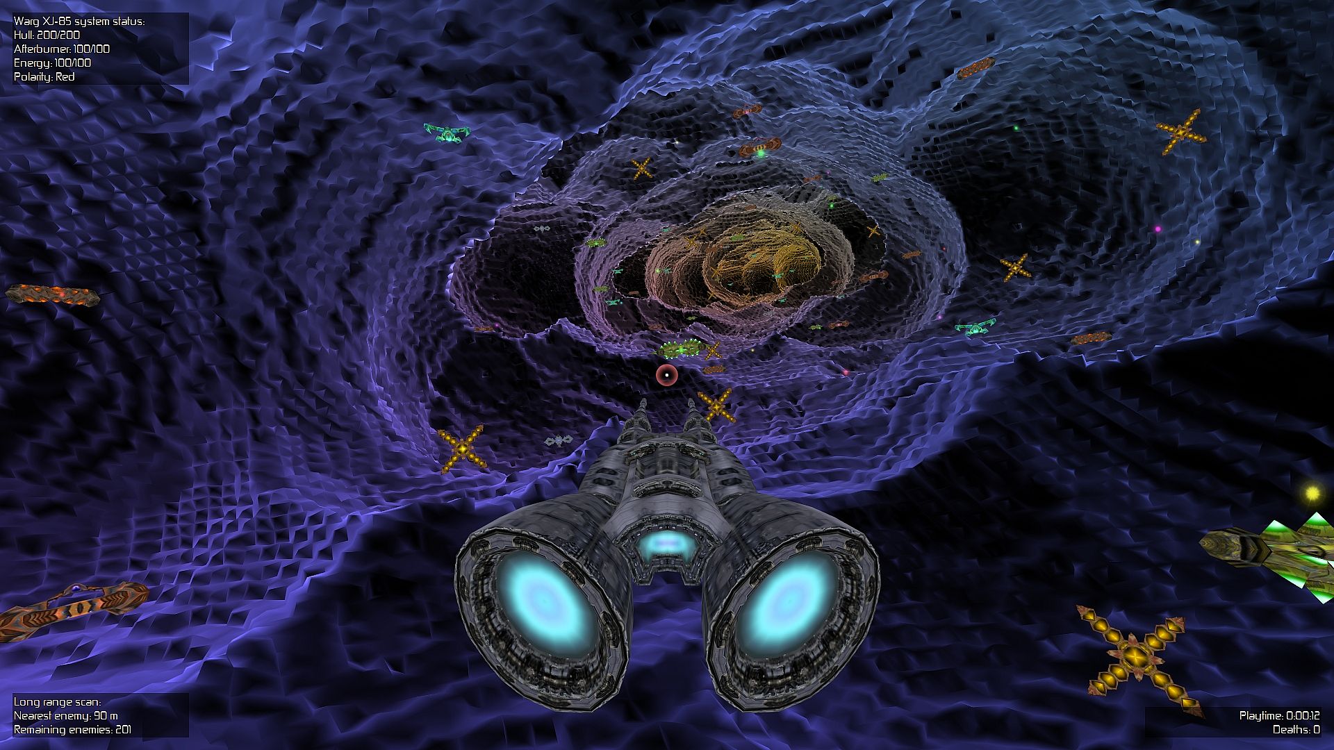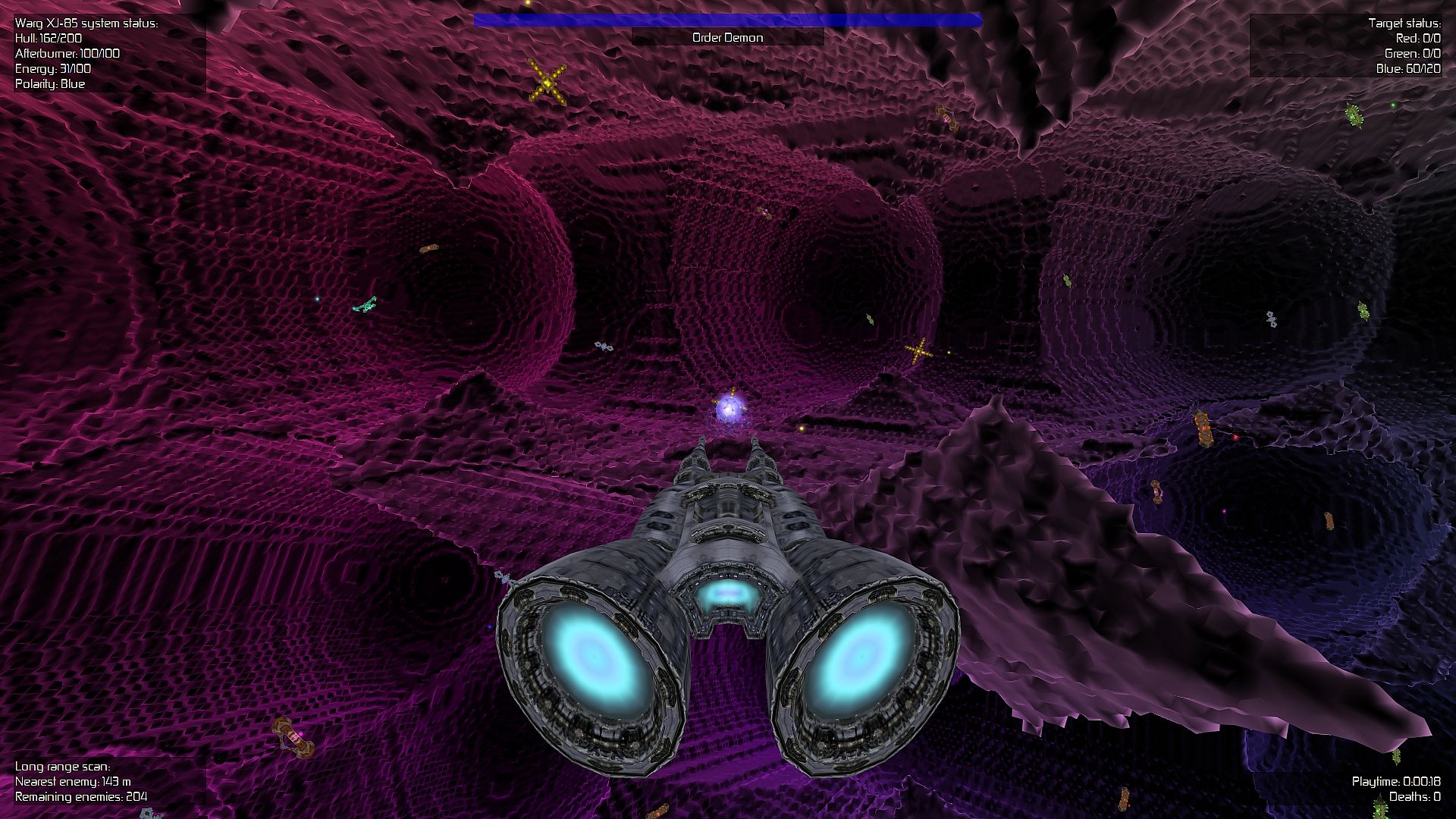 At its core, the gameplay revolves around piloting the Warg XJ-85 spaceship through procedurally generated caves filled with enemy ships. You fire projectiles in red, green, or blue, and each foe has a distinct color that requires a complementary shot to neutralize it by forming white. For instance, a yellow enemy demands a blue projectile to defeat it effectively. This color-matching system adds a layer of strategy to the fast-paced combat, as you switch shots while dodging obstacles and incoming fire in tight, winding dungeons.