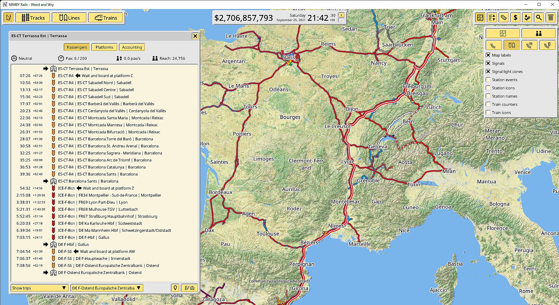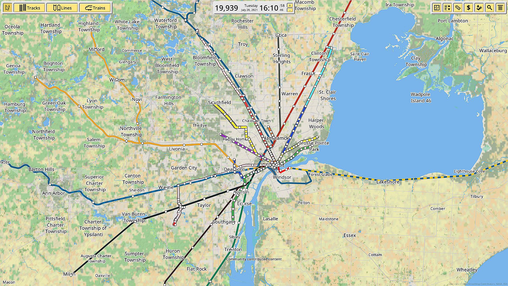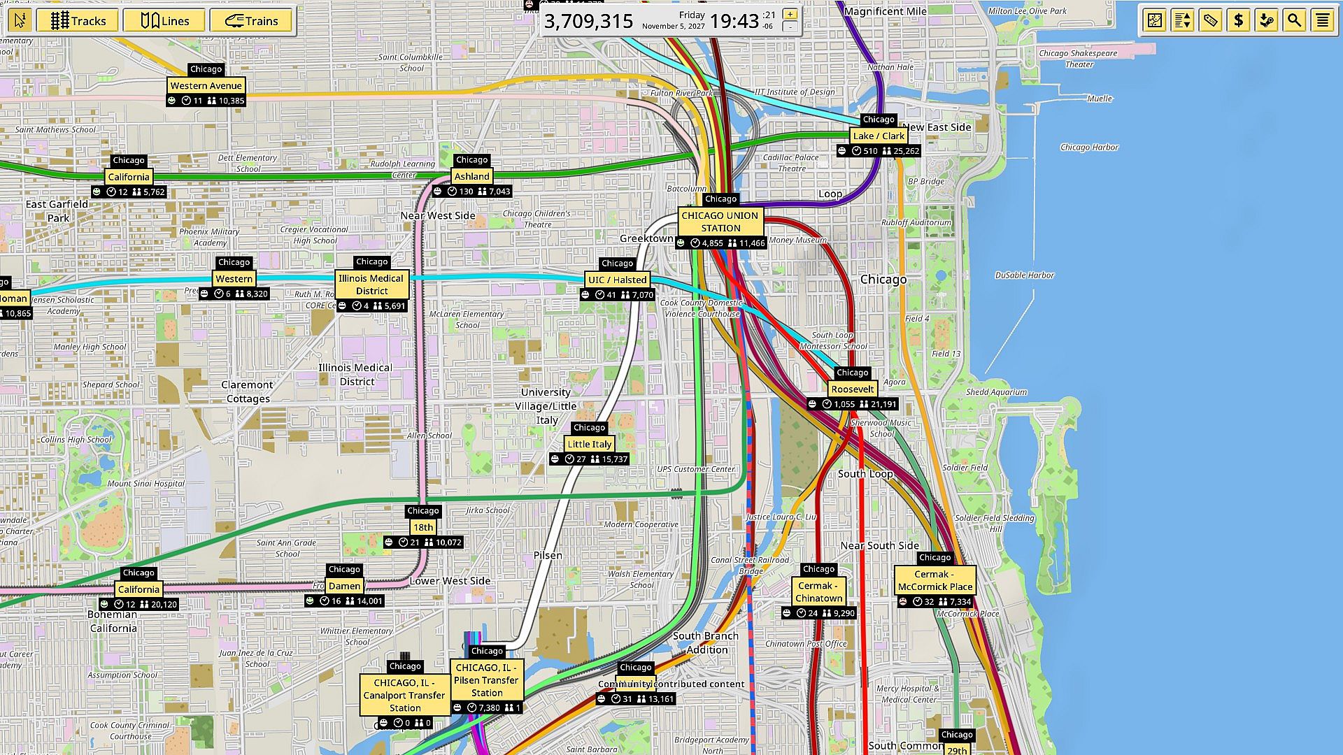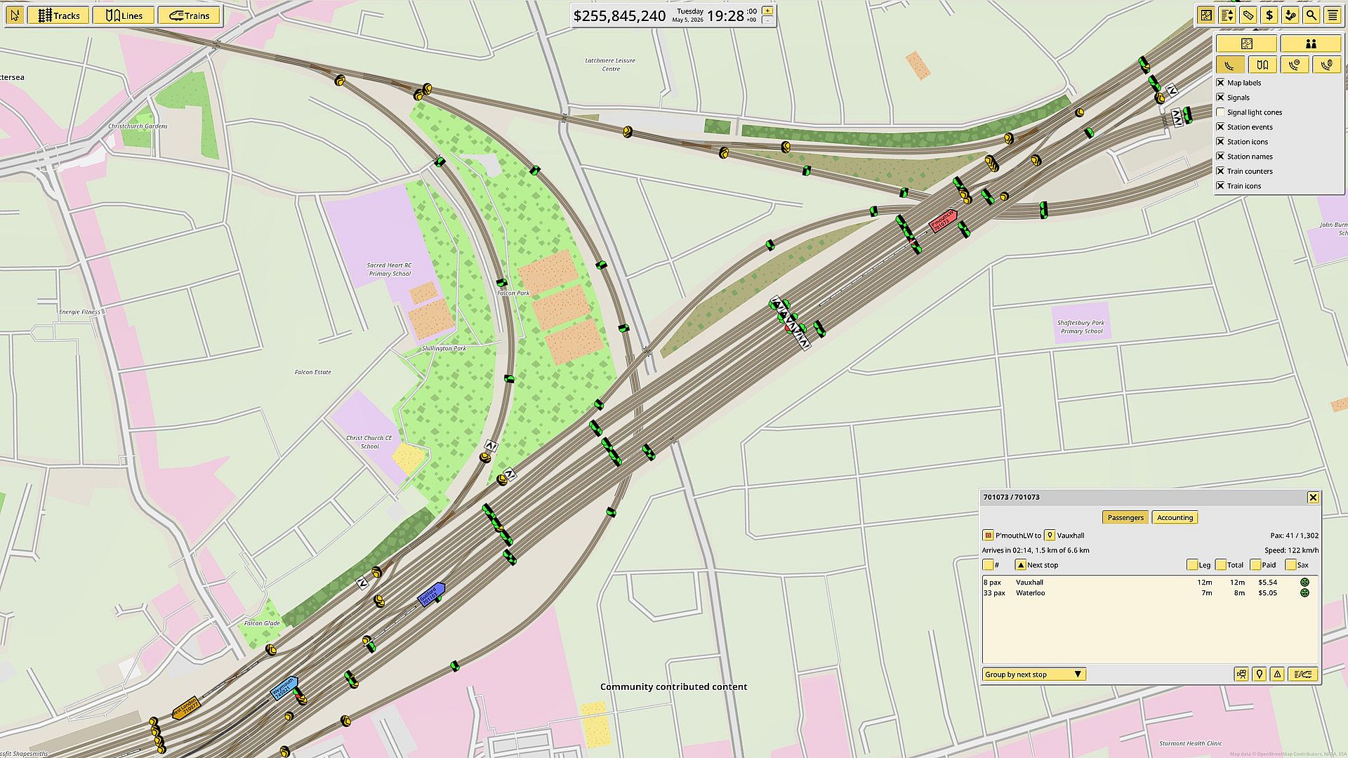 • Simulated train and station demand, down to simulating individual passengers. Passengers can, and will, engage in train trips that make them board multiple trains, waiting in transfer stations.